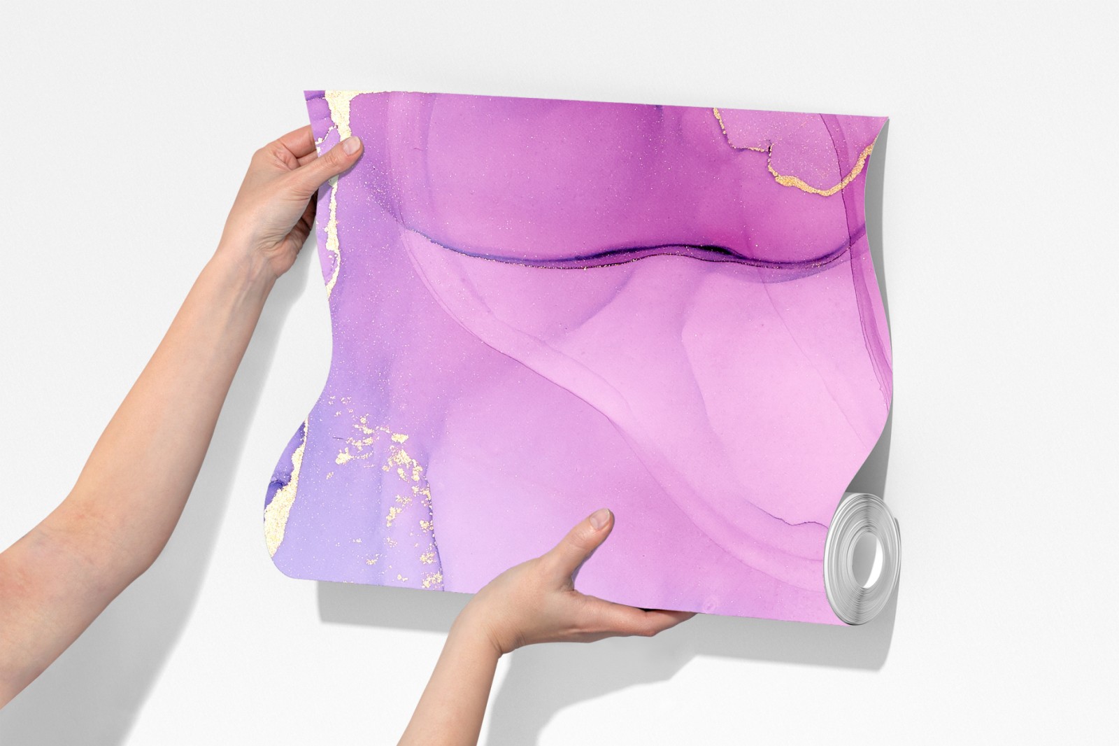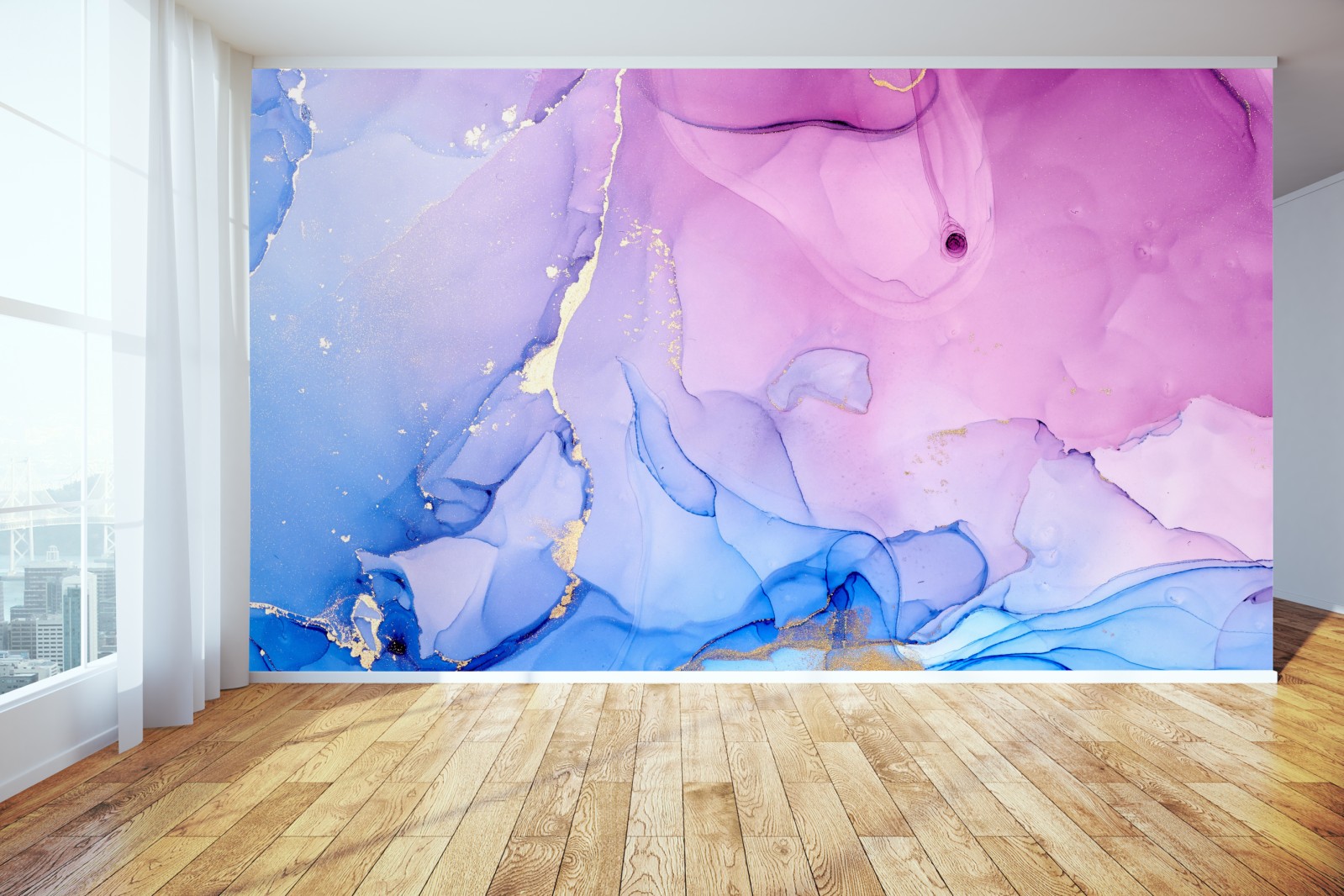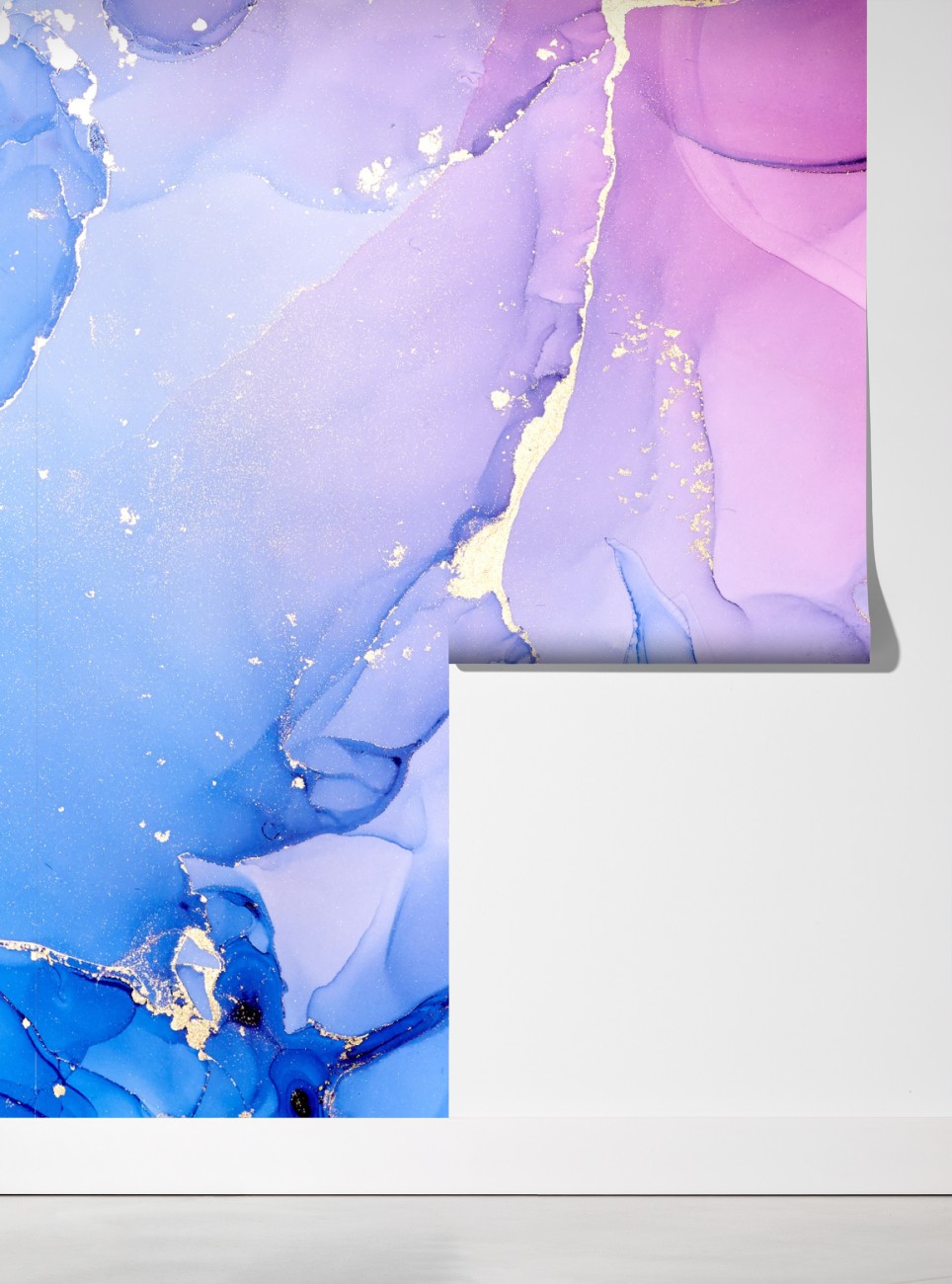 Zarte rosa-blaue marmorierte Komposition mit goldenen Akzenten, die modernen Räumen eine entspannte Atmosphäre verleiht.
