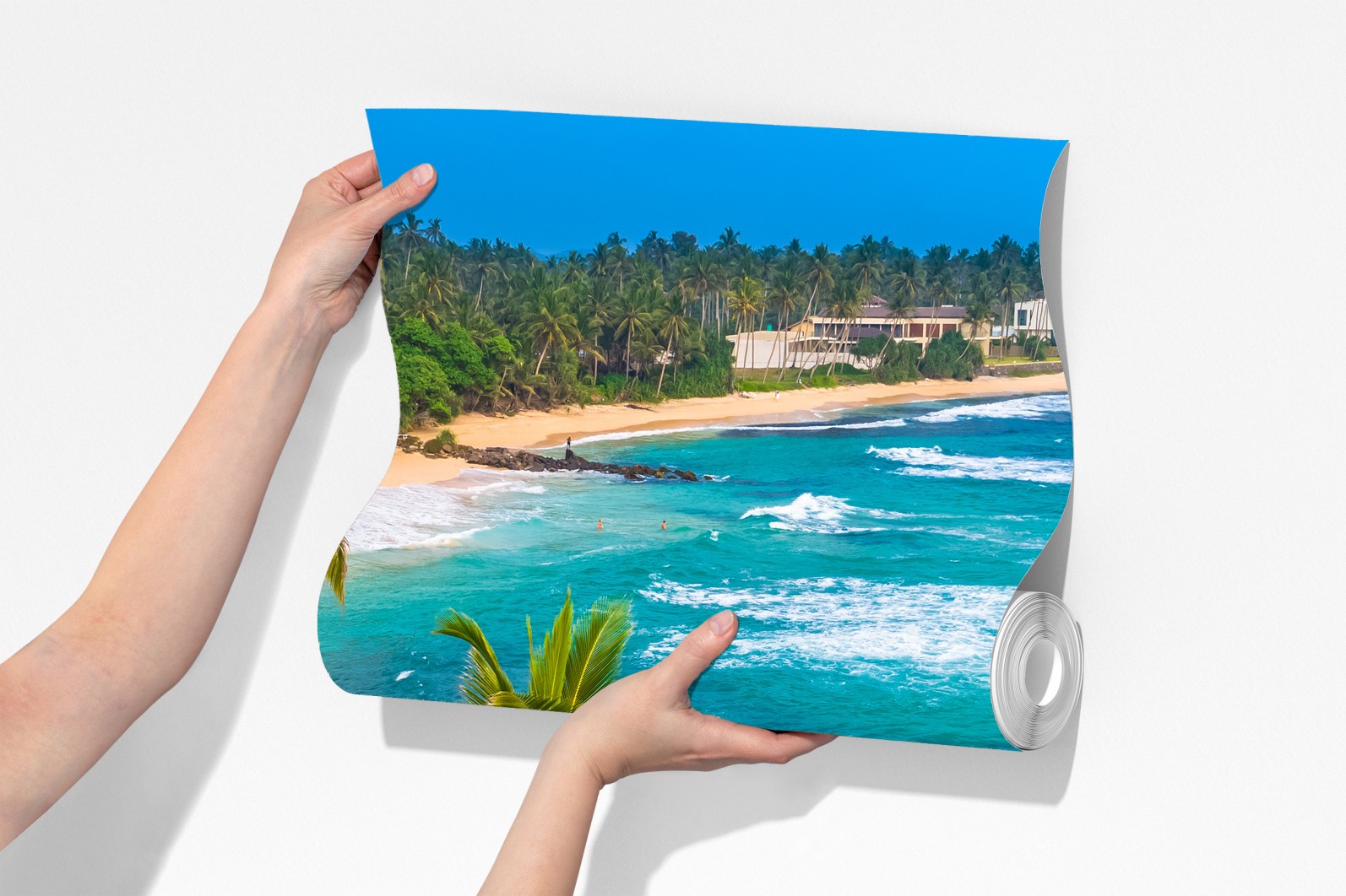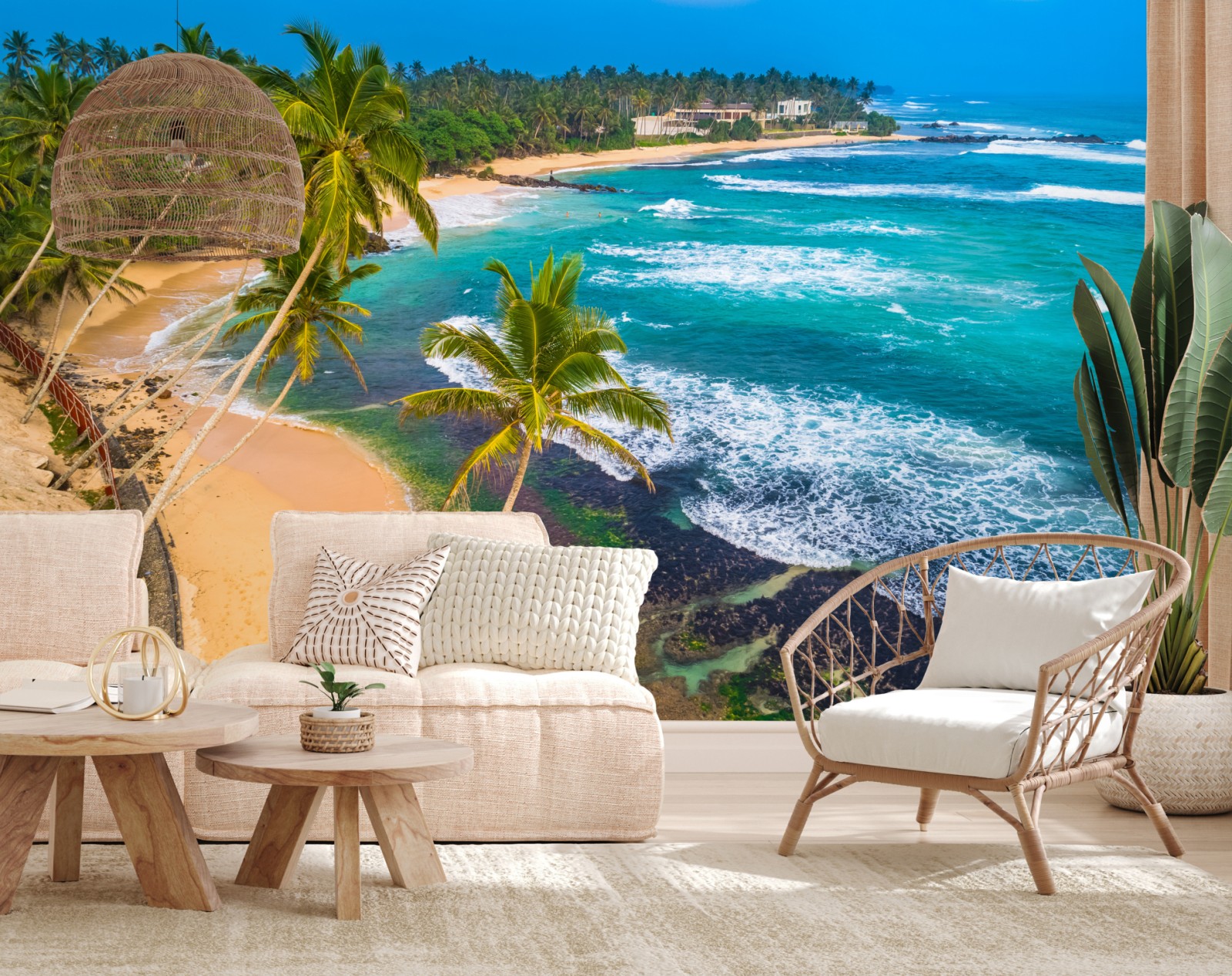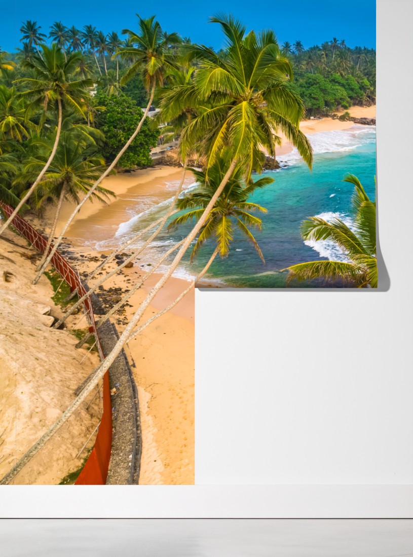 Bringen Sie Küstenidylle in Ihr Zuhause mit einem lebendigen Luftbild von türkisfarbenem Meer, wiegenden Palmen und goldenem Sand.