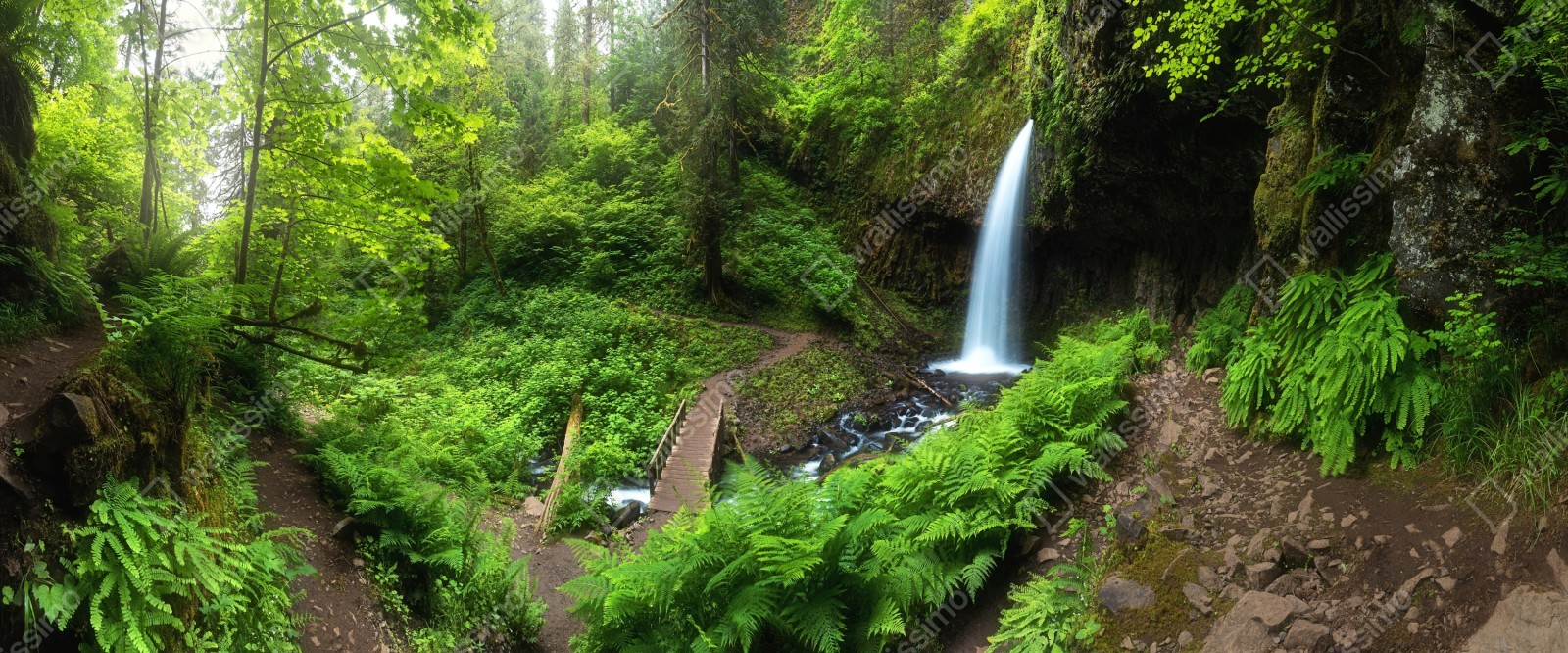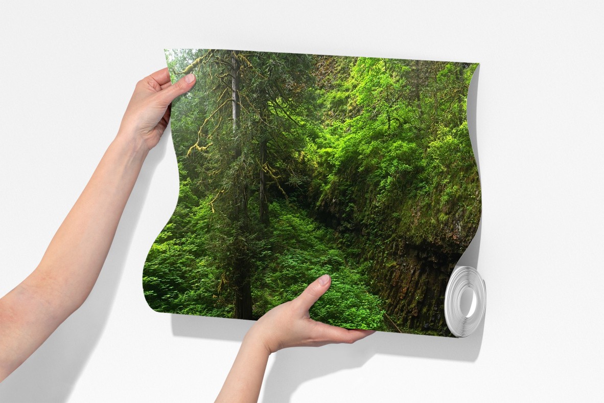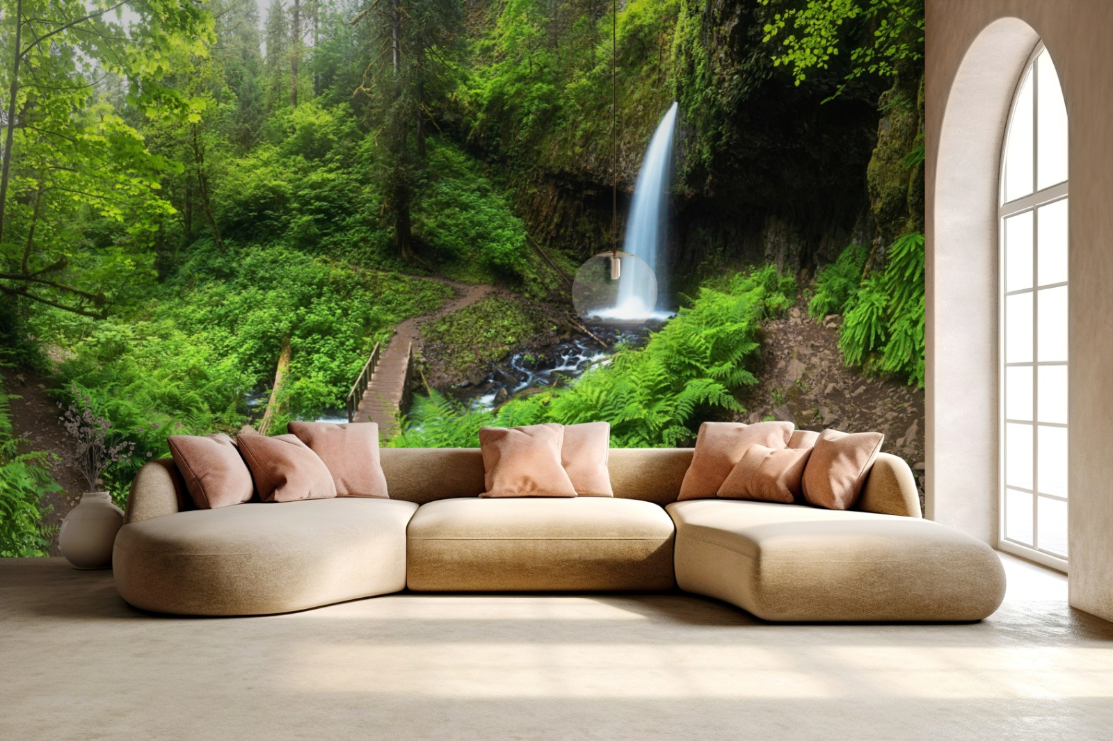 Bringen Sie die beruhigende Atmosphäre eines üppigen Waldwasserfalls in Ihr Zuhause mit diesem lebendigen Naturmotiv.