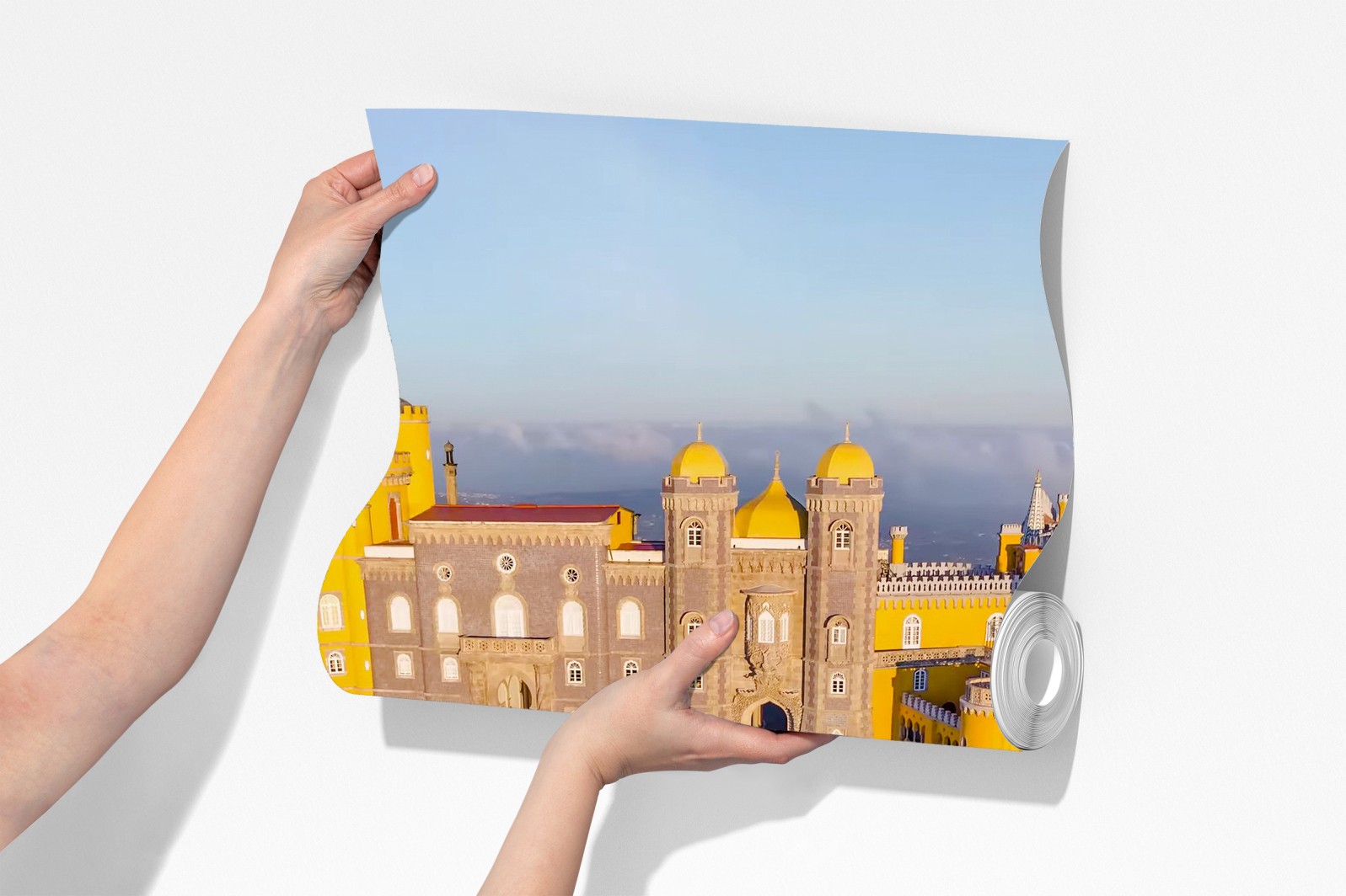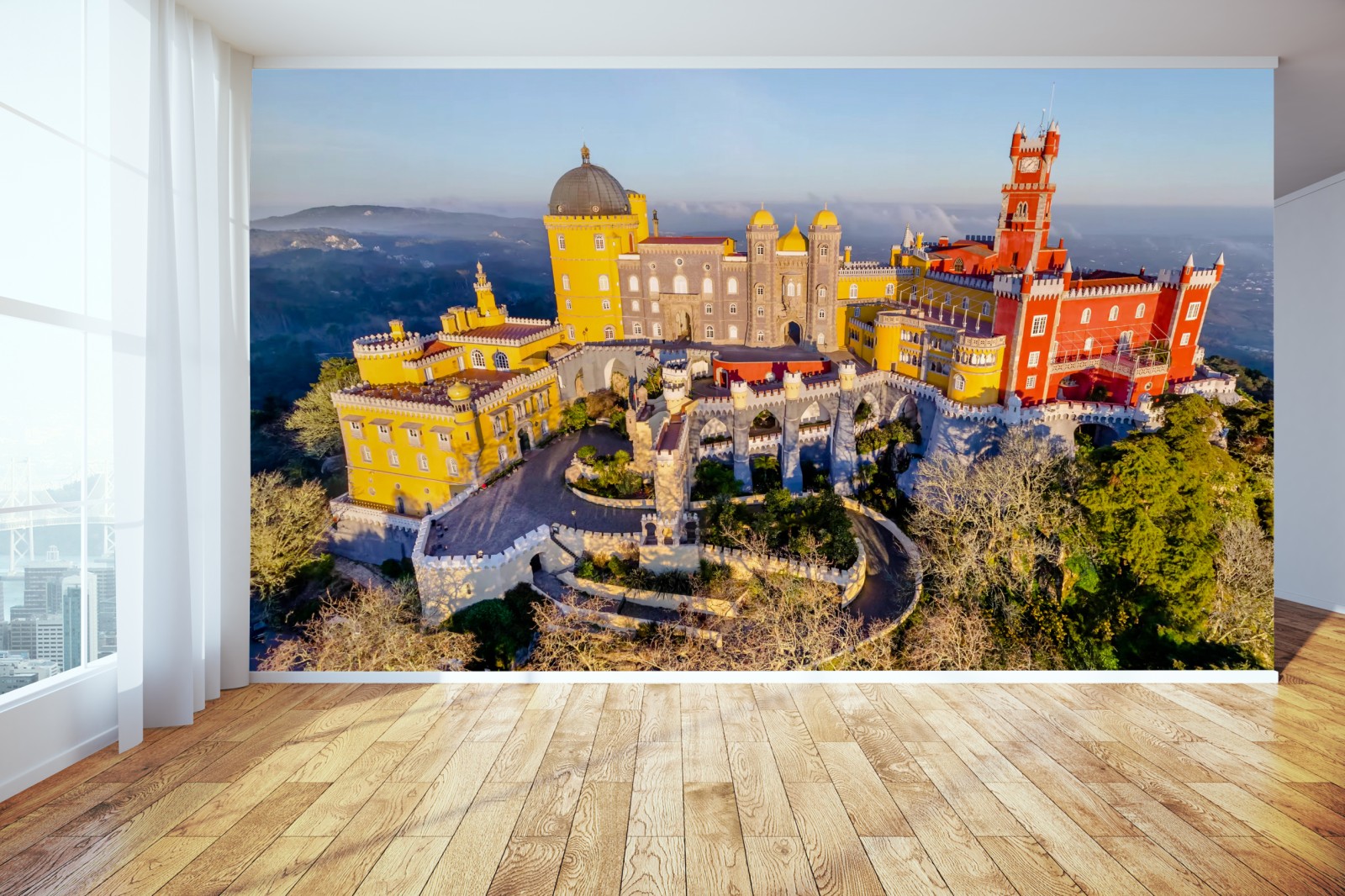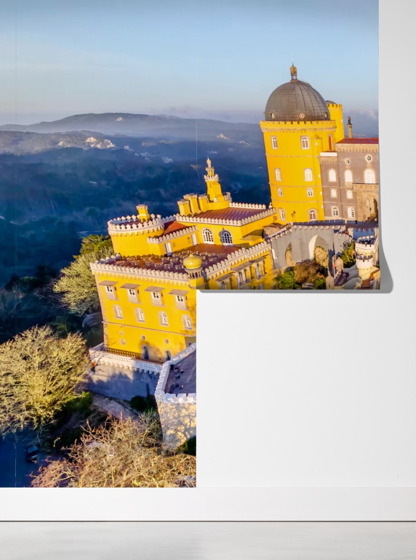 Bringen Sie lebendige Geschichte an Ihre Wand mit dieser Luftaufnahme des Palastes Pena in Sintra, die kräftige Farben und romantische Architektur zeigt.