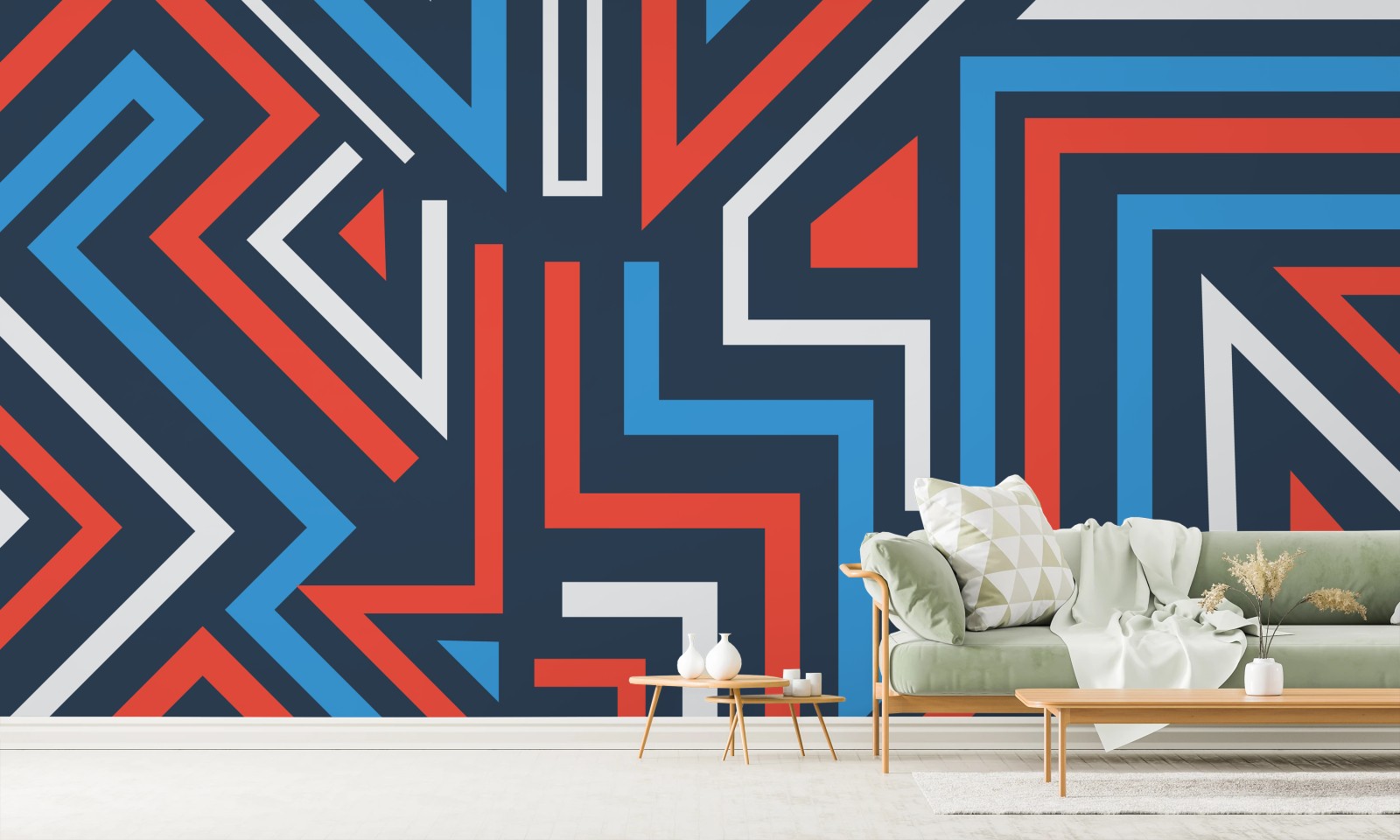 Kräftiges geometrisches Muster bringt moderne urbane Energie in jeden Raum mit klaren Linien und kräftigen Farben.MehrWeniger