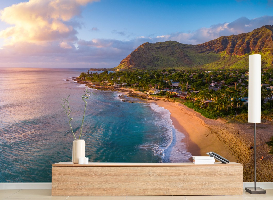 Bringen Sie den warmen Schein eines tropischen Sonnenuntergangs in Ihr Zuhause mit diesem Panoramabild, das türkisfarbenes Wasser, goldenen Sand und eindrucksvolle Berge zeigt.