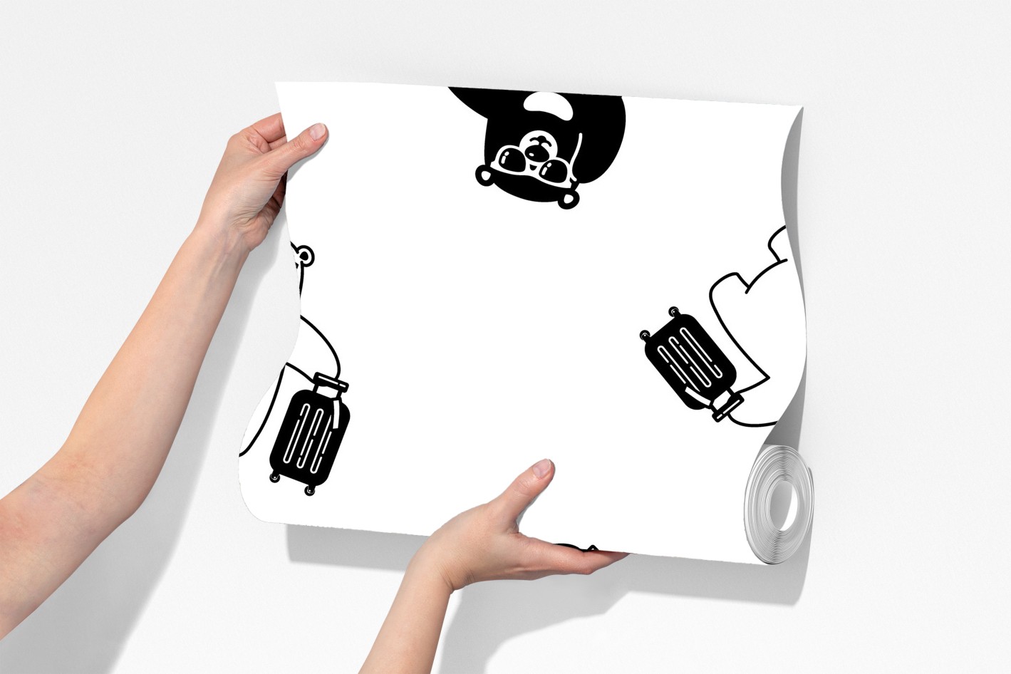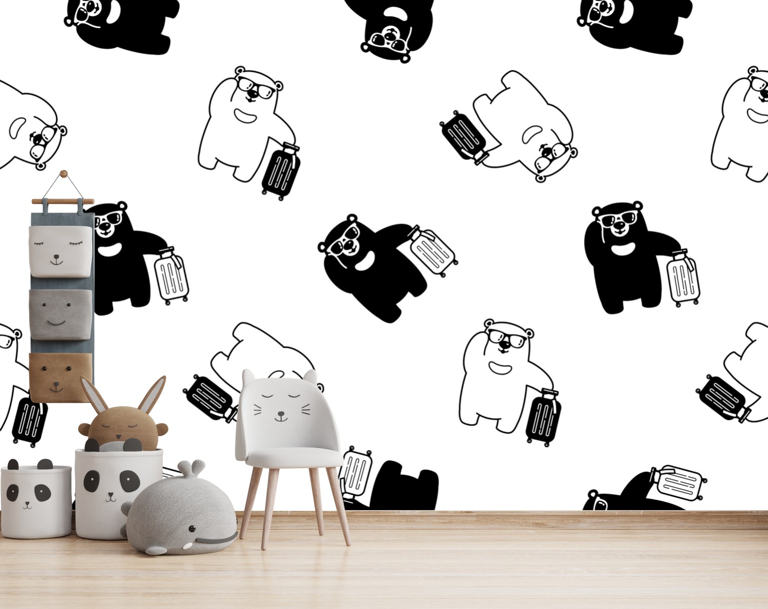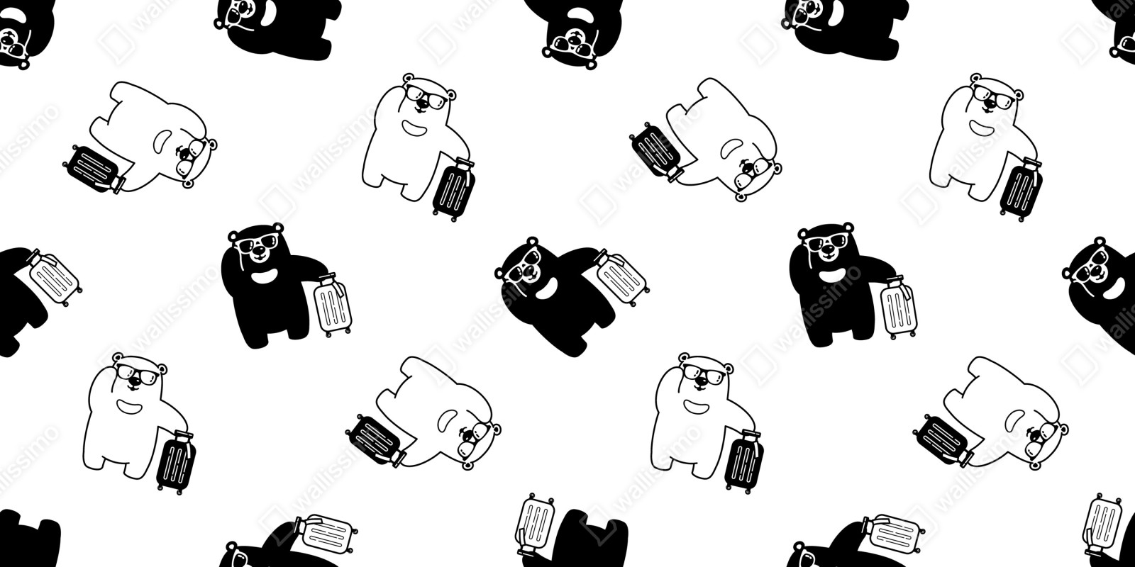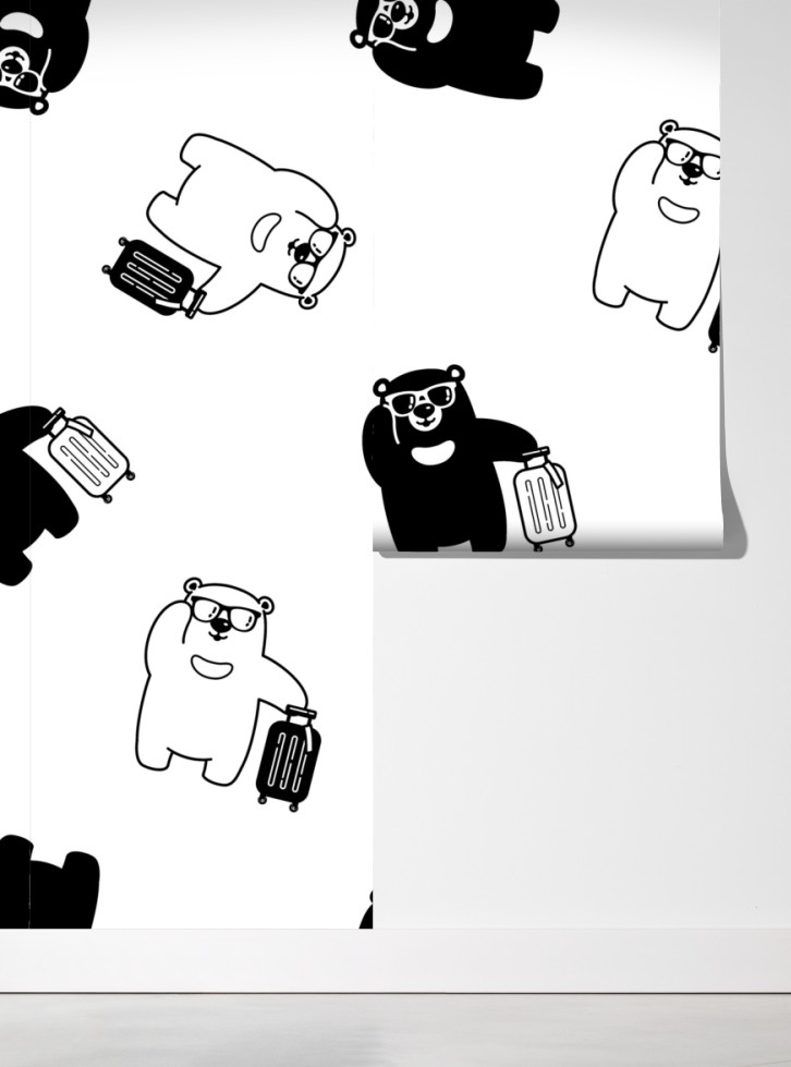 Charmantes schwarz-weißes Bärenmuster mit Koffern verleiht jedem Kinderzimmer oder modernen Raum verspielten Charakter.