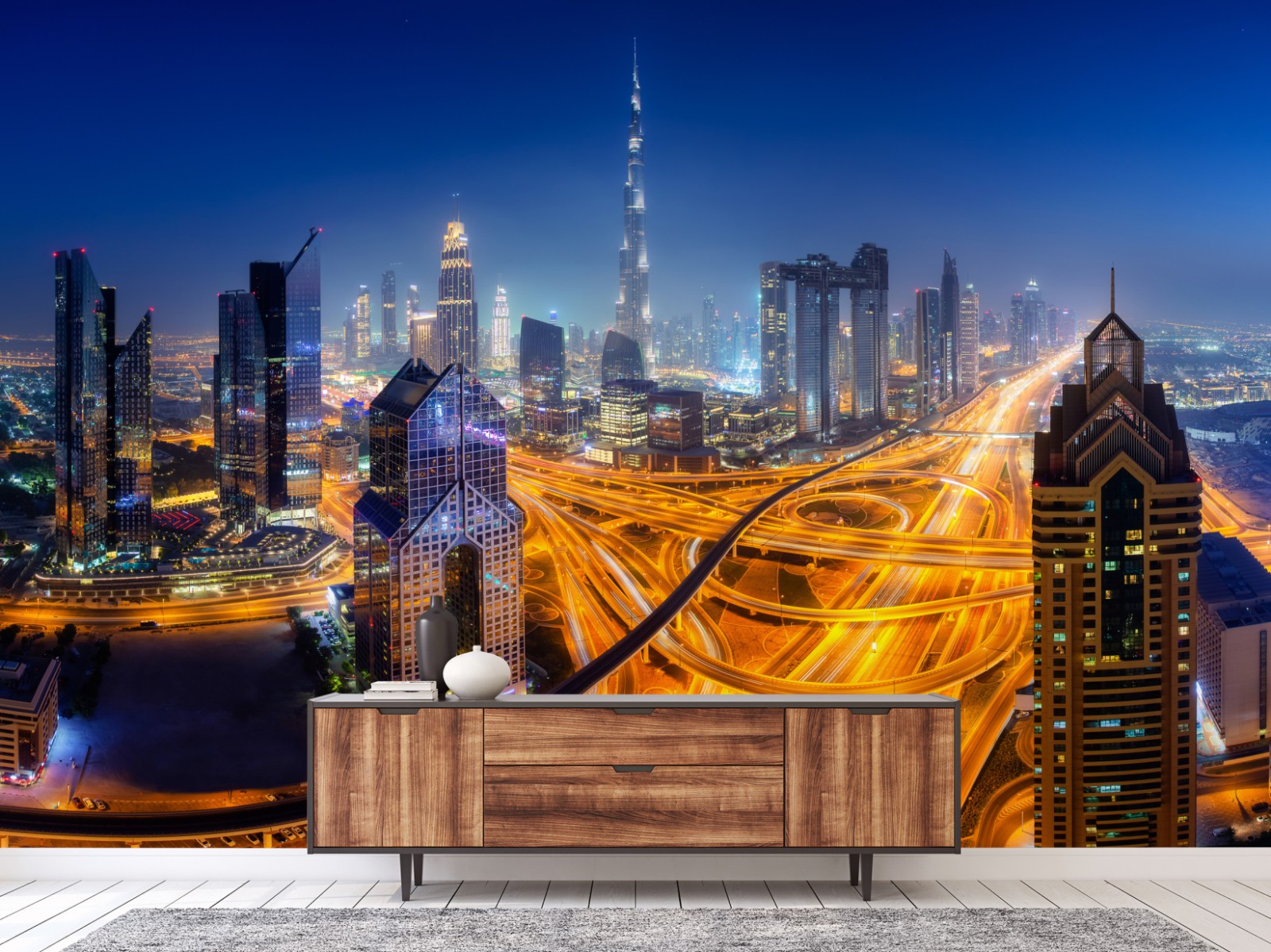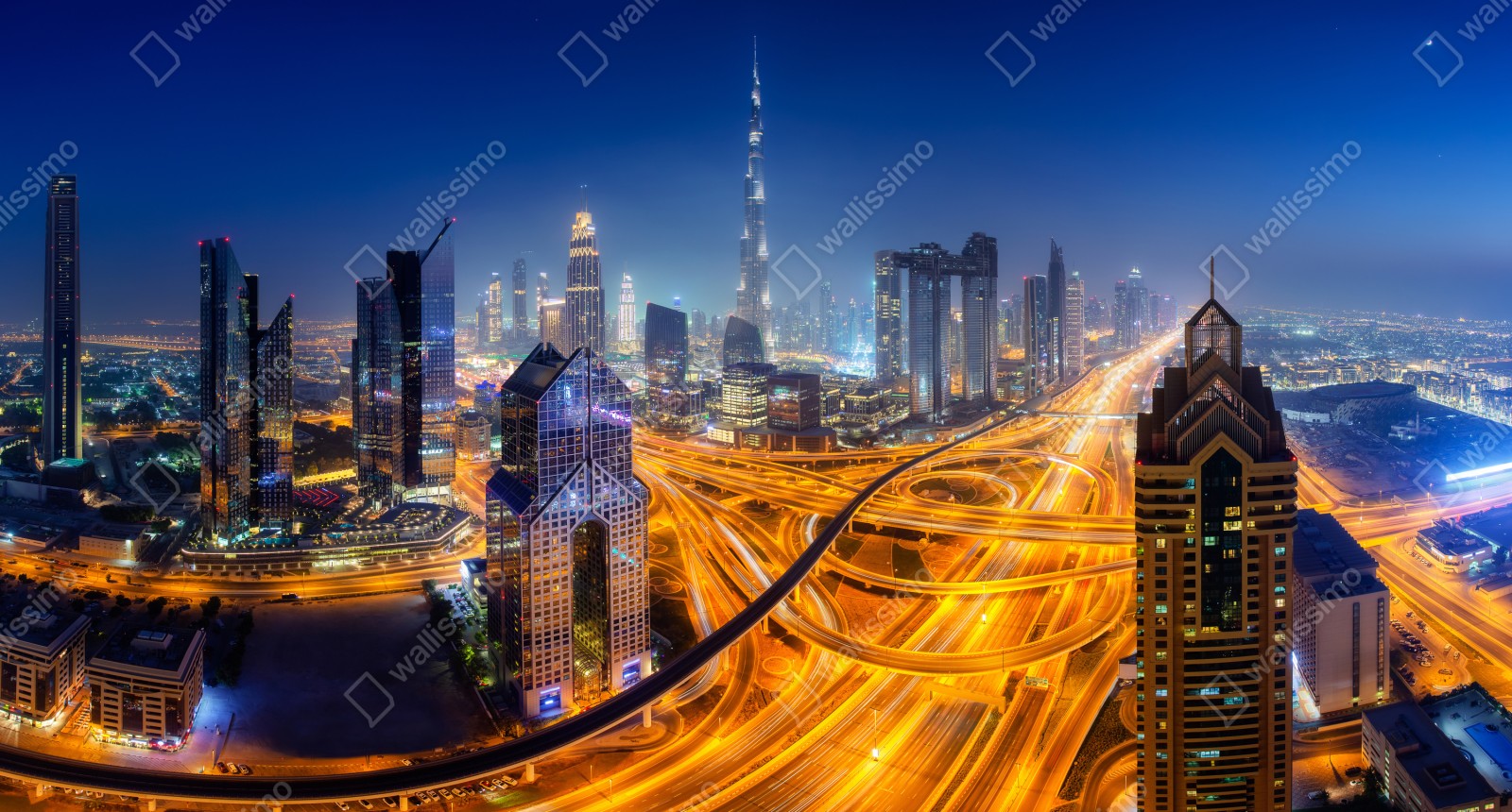 Erleben Sie die nächtliche Energie von Dubai mit dieser Panoramaaufnahme, die den Burj Khalifa und leuchtende Autobahnen zeigt.