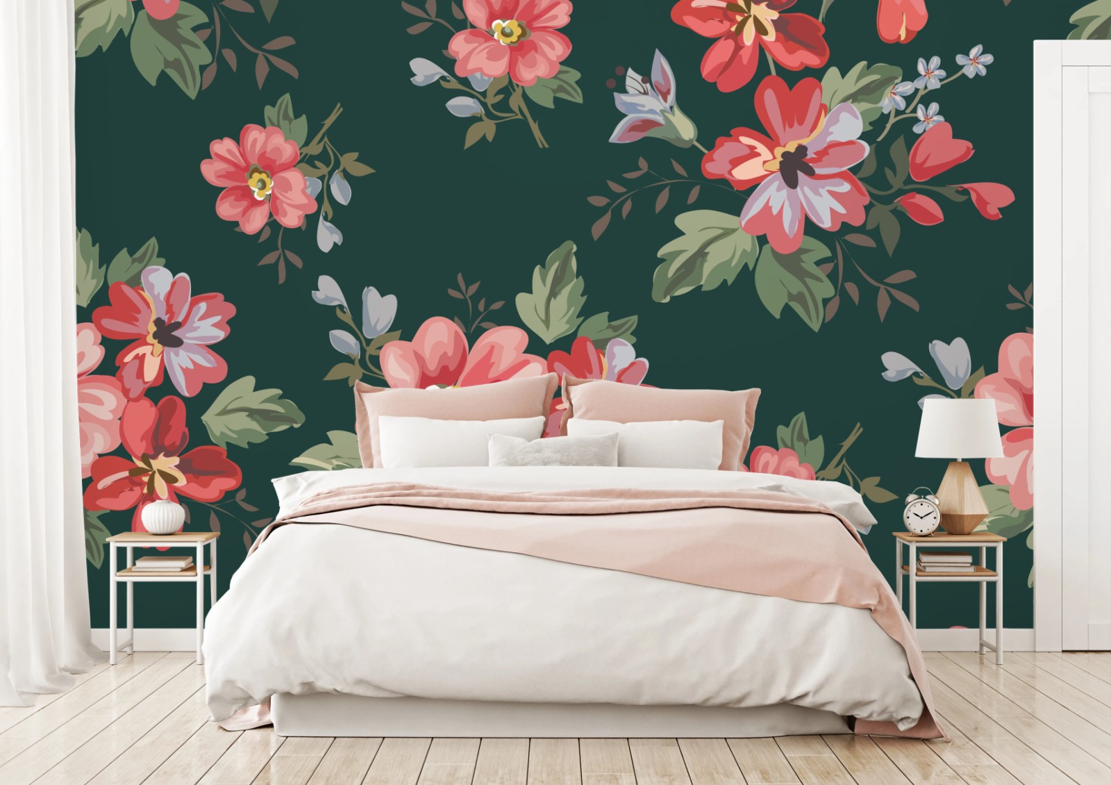 Fototapete Vintage rosa blumenmuster auf tiefgrün