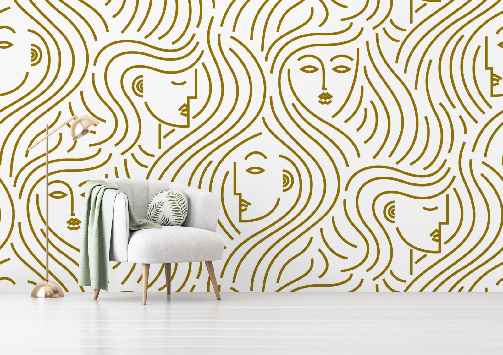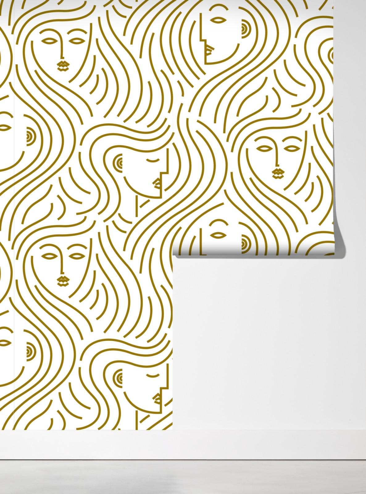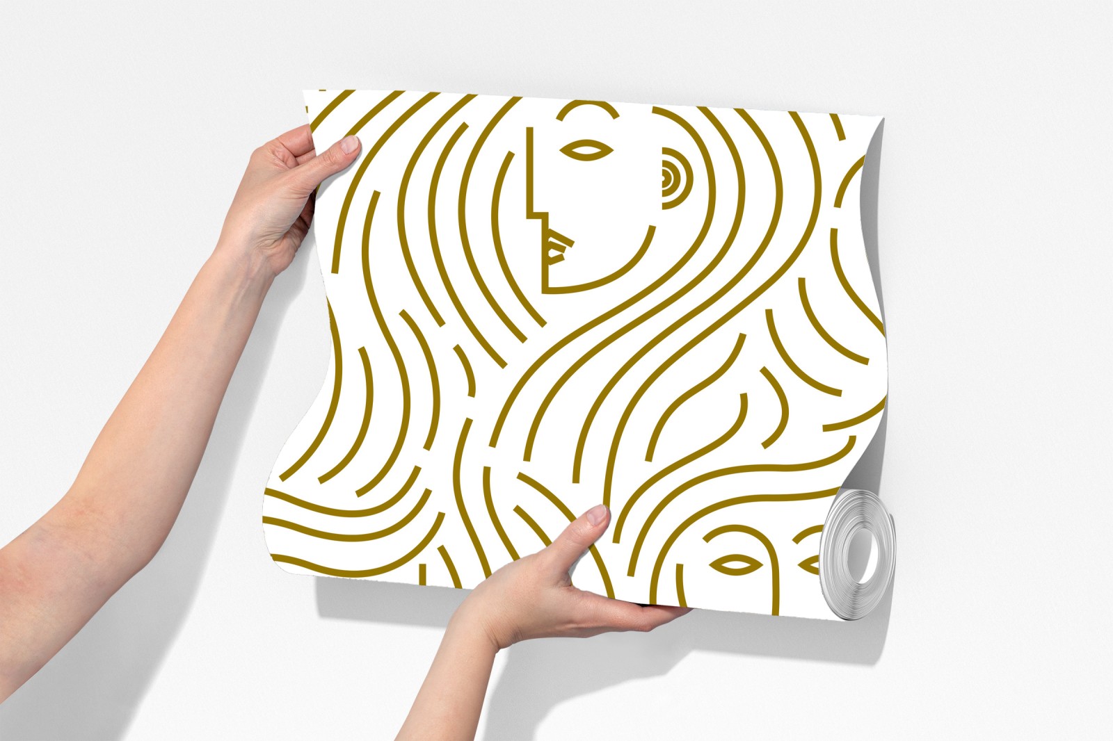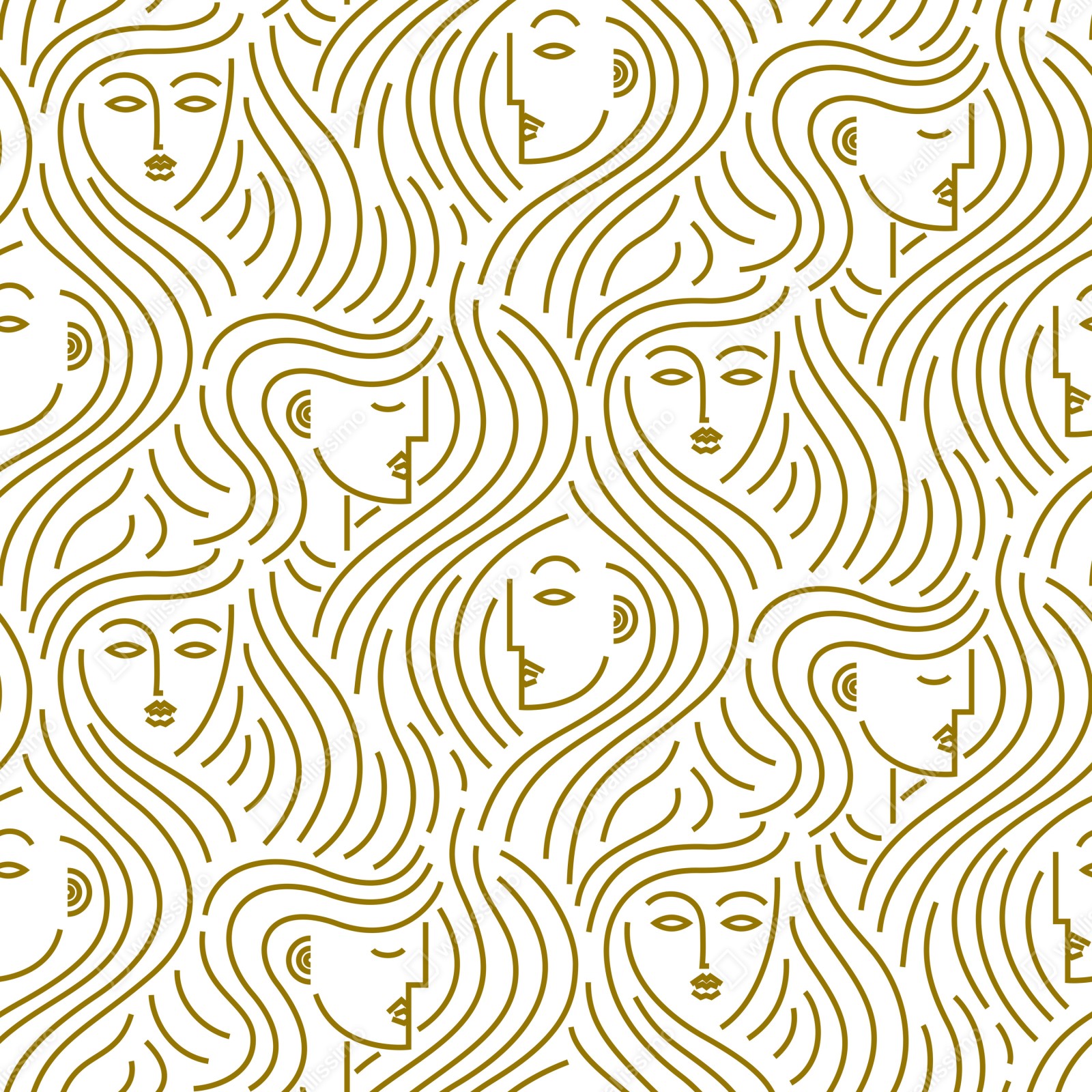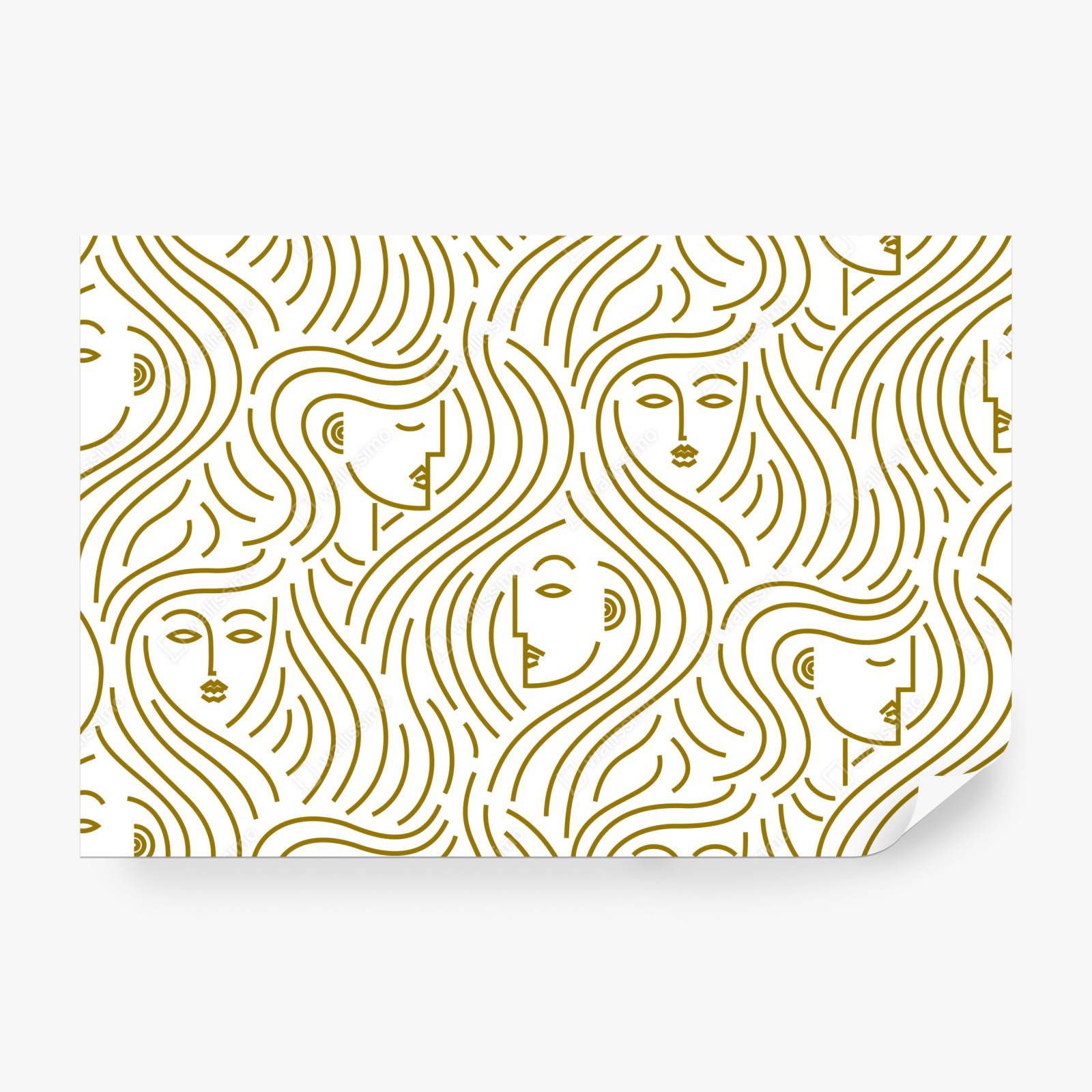 Verleihen Sie Ihren Wänden Eleganz mit einem luxuriösen, nahtlosen Muster aus goldenen, abstrakten Frauenprofilen und fließendem Haar.