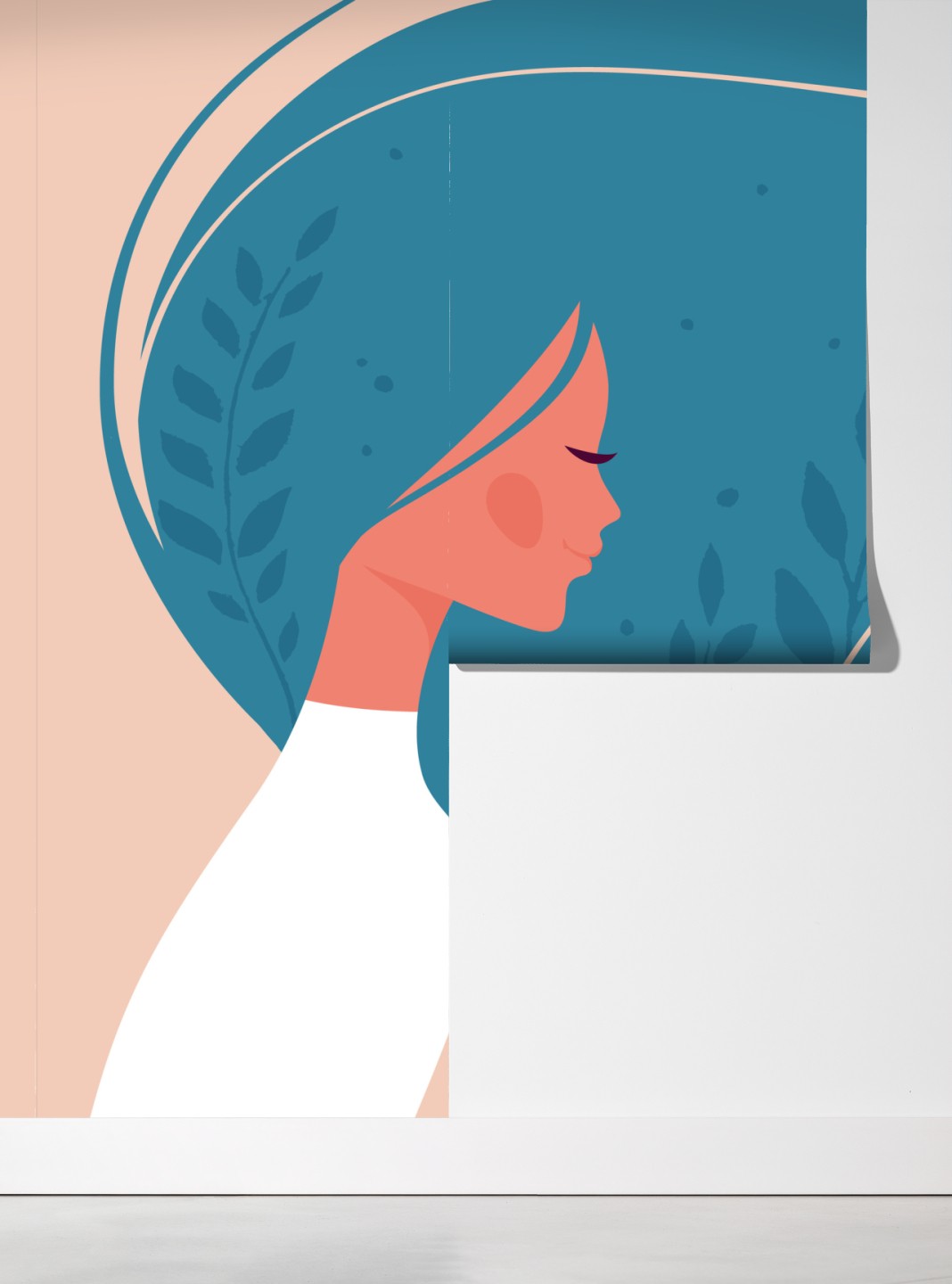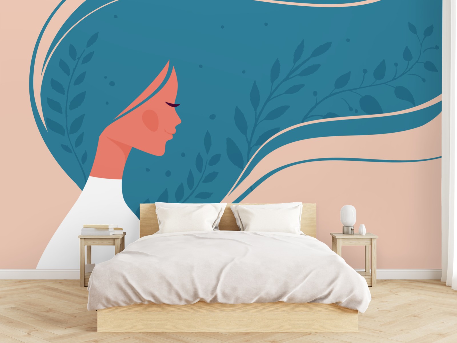 Bringen Sie eine ruhige, feminine Atmosphäre in Ihr Zuhause mit dieser pastellfarbenen Illustration einer Frau im Profil und fließendem Haar.