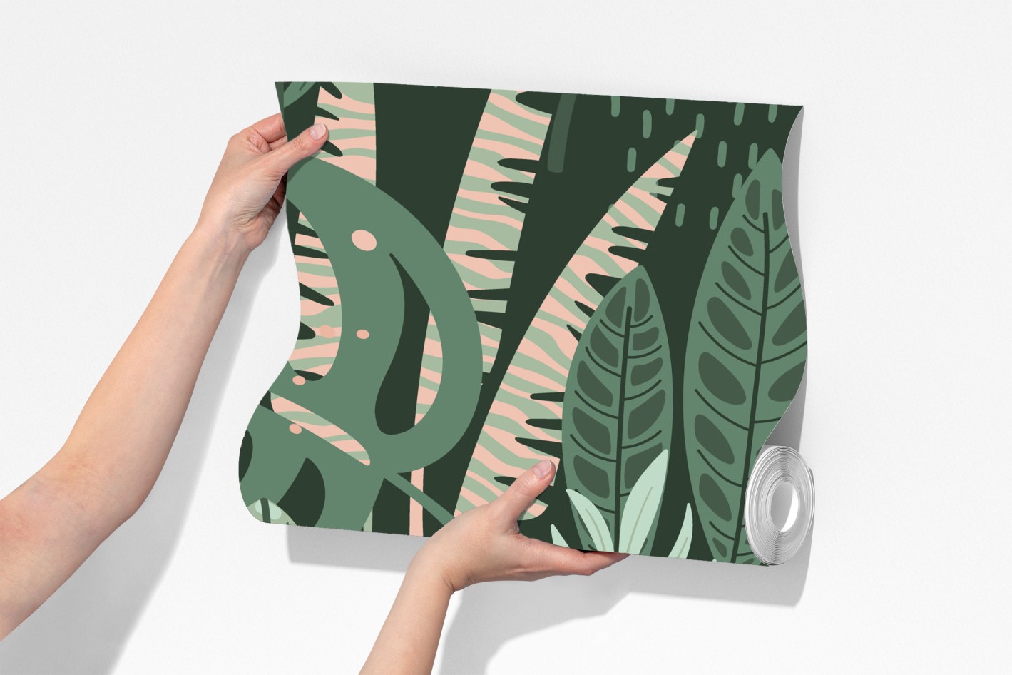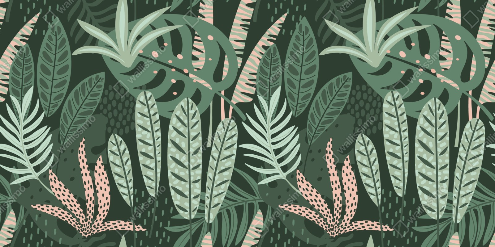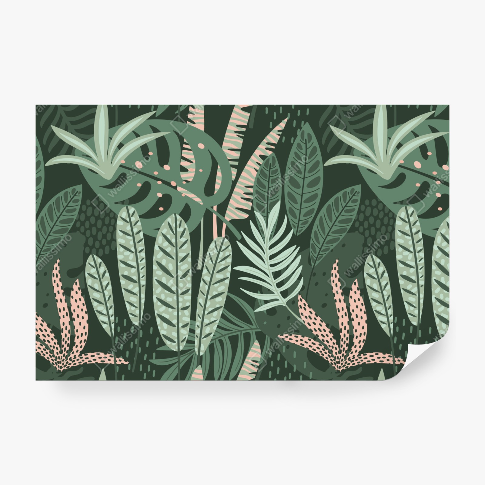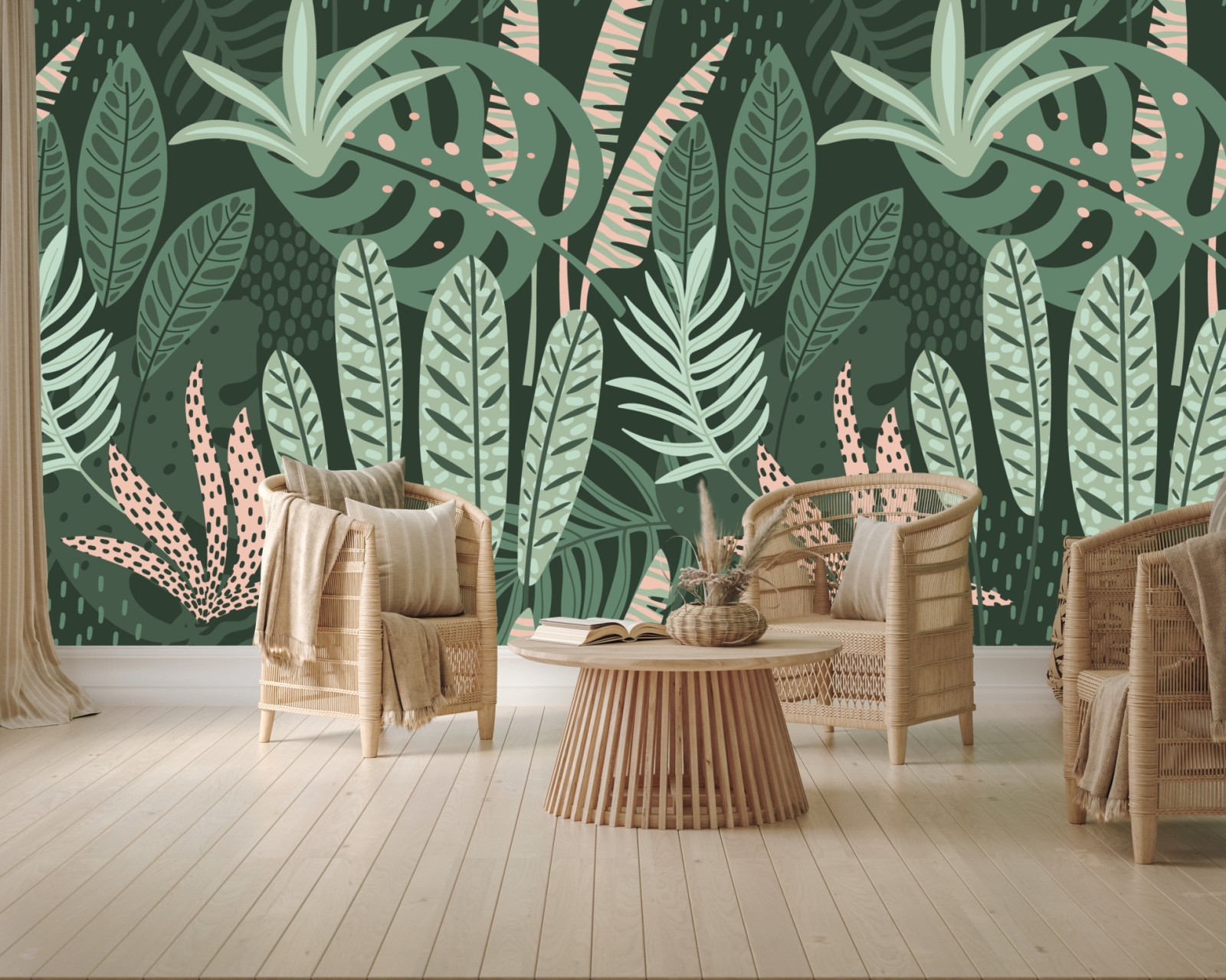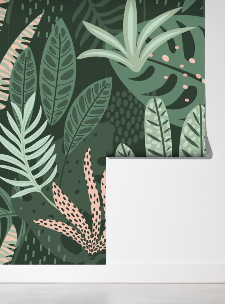 Bringen Sie beruhigende Grüntöne und zarte rosa Akzente in Ihren Raum mit diesem botanischen Blattmuster, ideal für einen naturinspirierten Akzent.