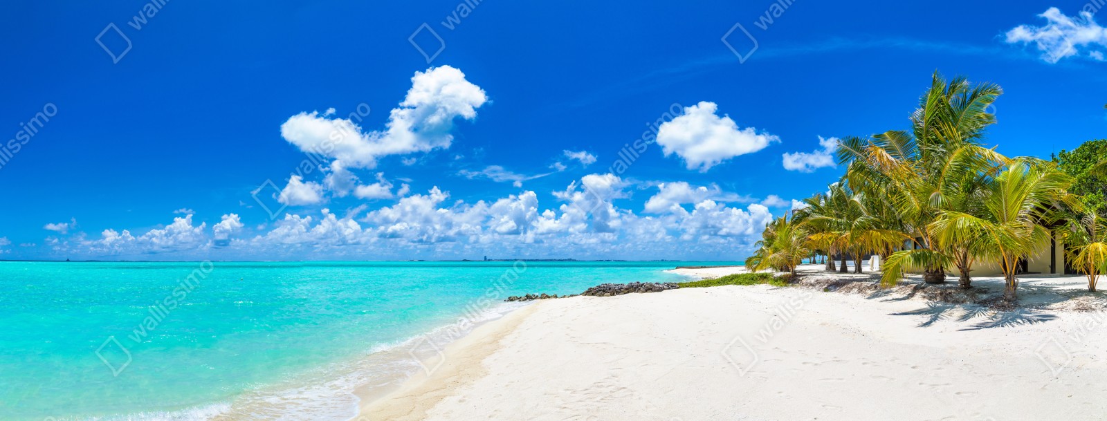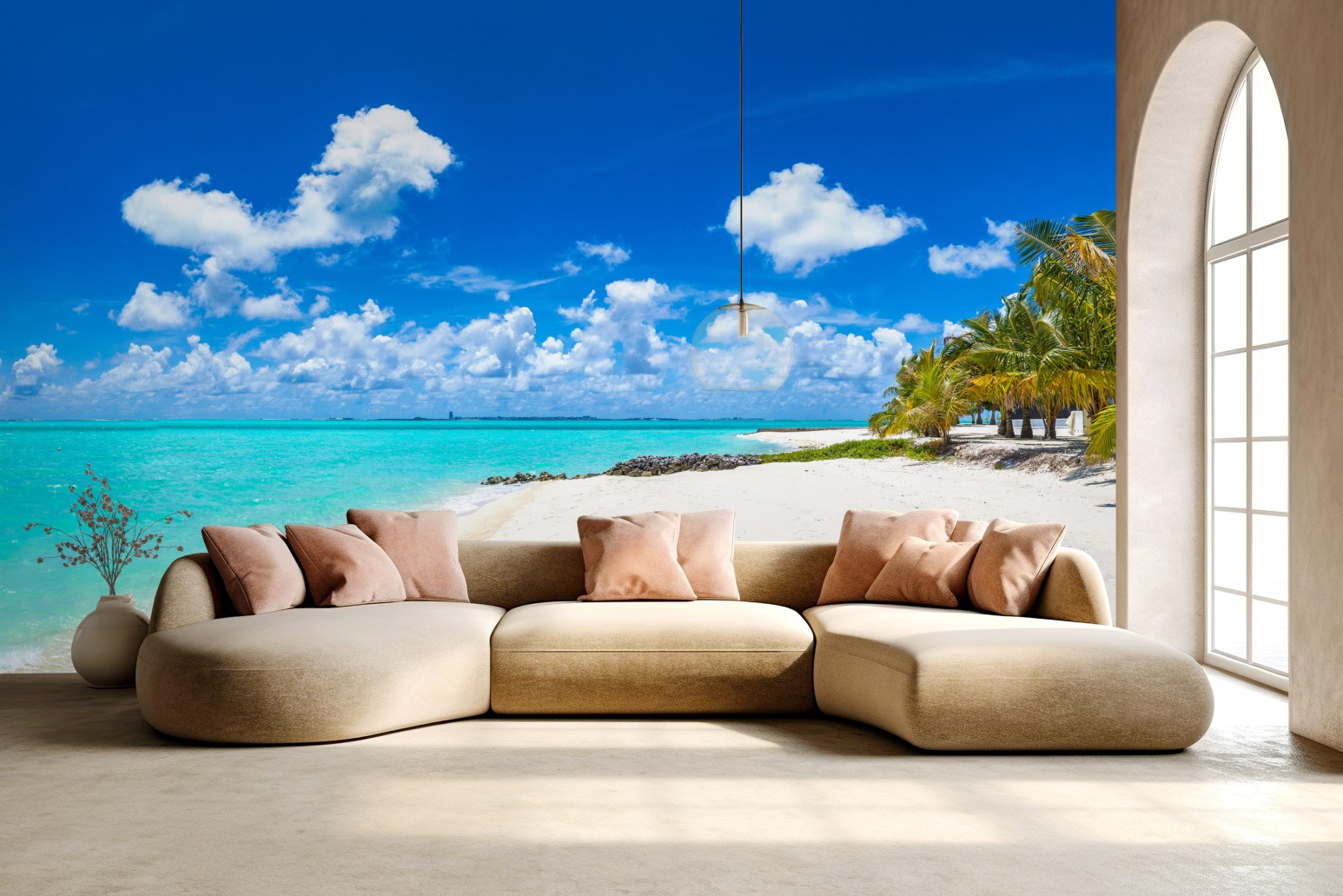 Tauchen Sie ein in einen sonnigen Strand auf den Malediven mit türkisfarbenem Wasser, sanft wiegenden Palmen und feinem weißen Sand, der Ruhe in jeden Raum bringt.