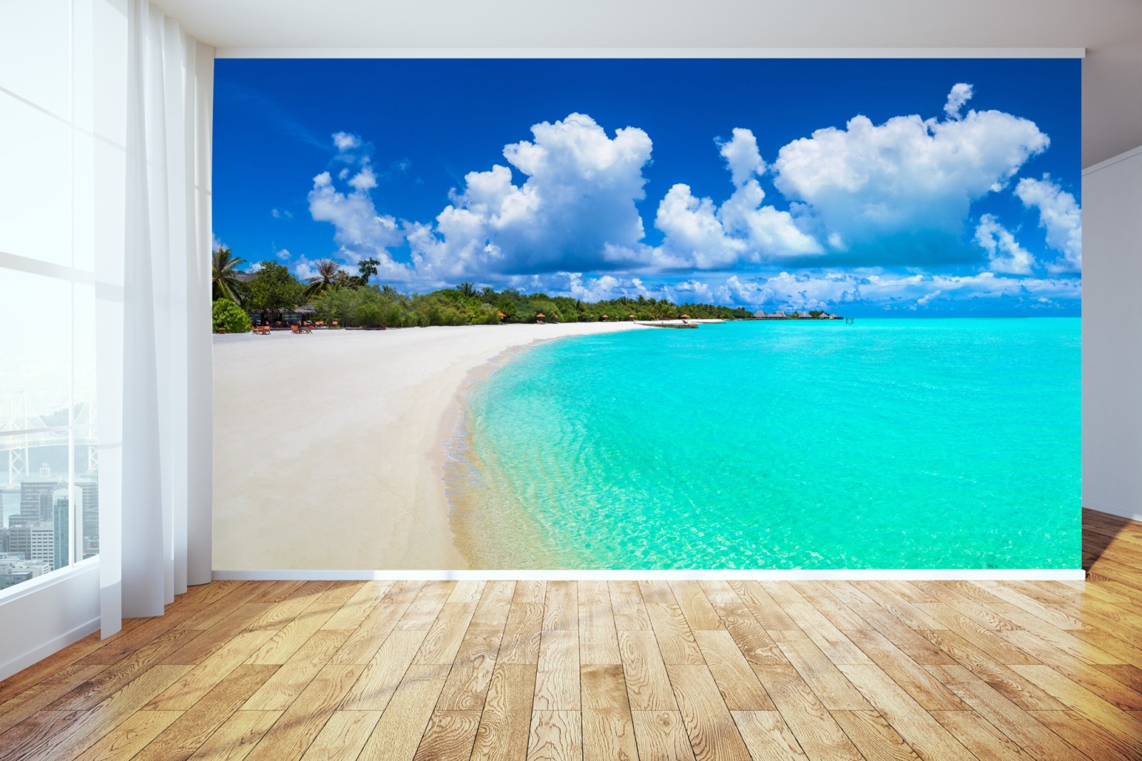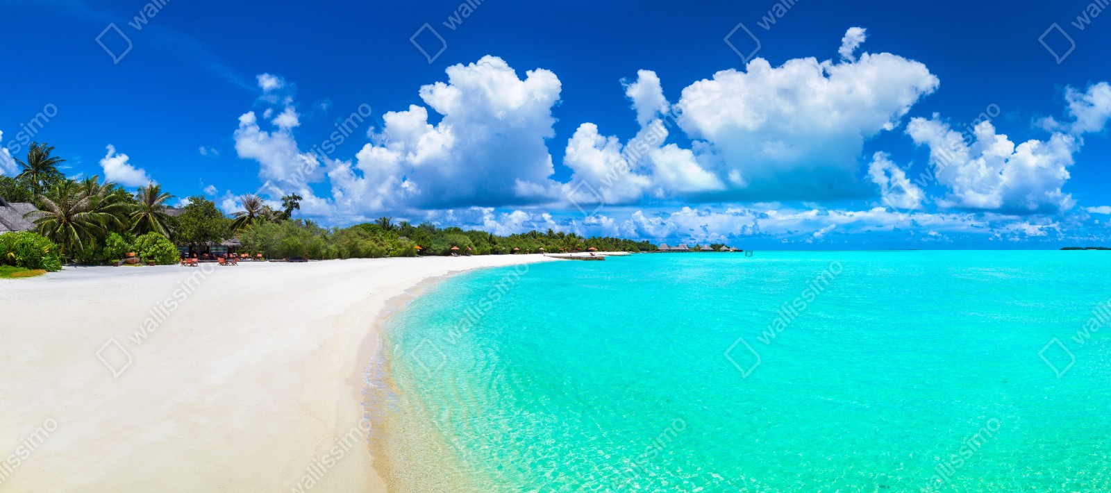 Bringen Sie mit dieser lebendigen Panoramaaufnahme der Malediven mit türkisfarbenem Wasser, weißem Sand und üppigen Palmen eine Inselatmosphäre an Ihre Wand.
