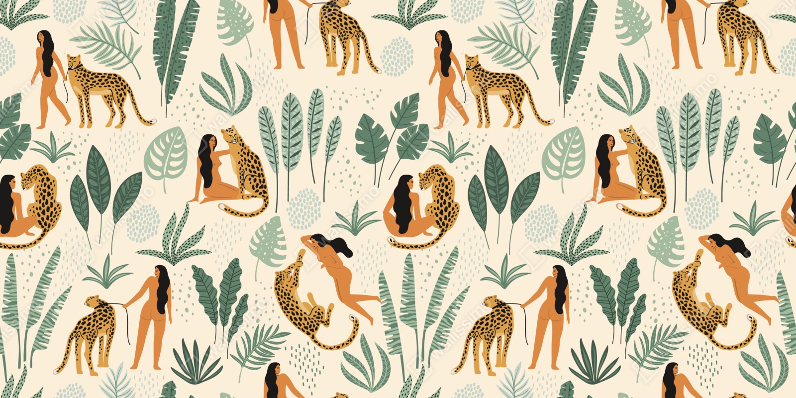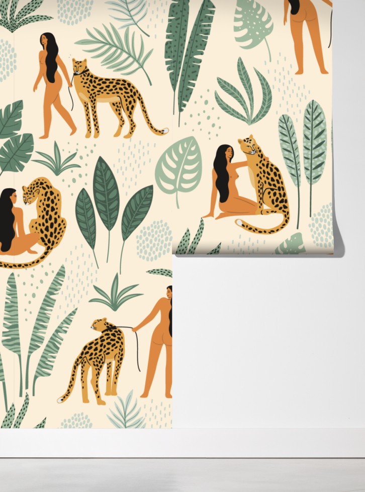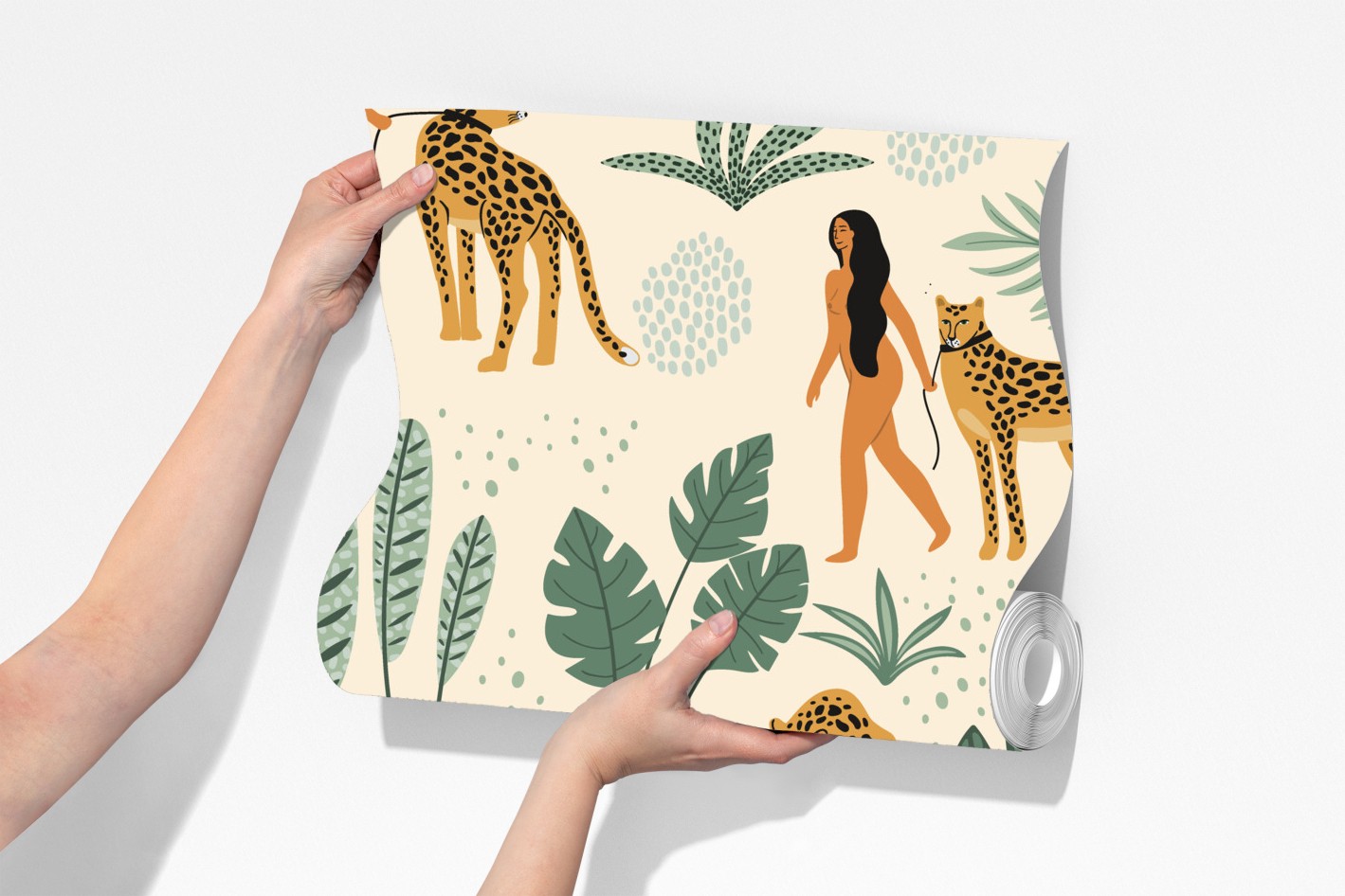 Bringen Sie exotische Eleganz in Ihr Zuhause mit diesem tropischen Muster aus Geparden und botanischen Motiven.