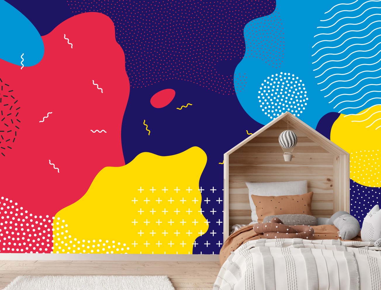 Helle und energiegeladene abstrakte Komposition mit kräftigen Formen und Farben, ideal für moderne Innenräume und verspielte Räume.MehrWeniger
