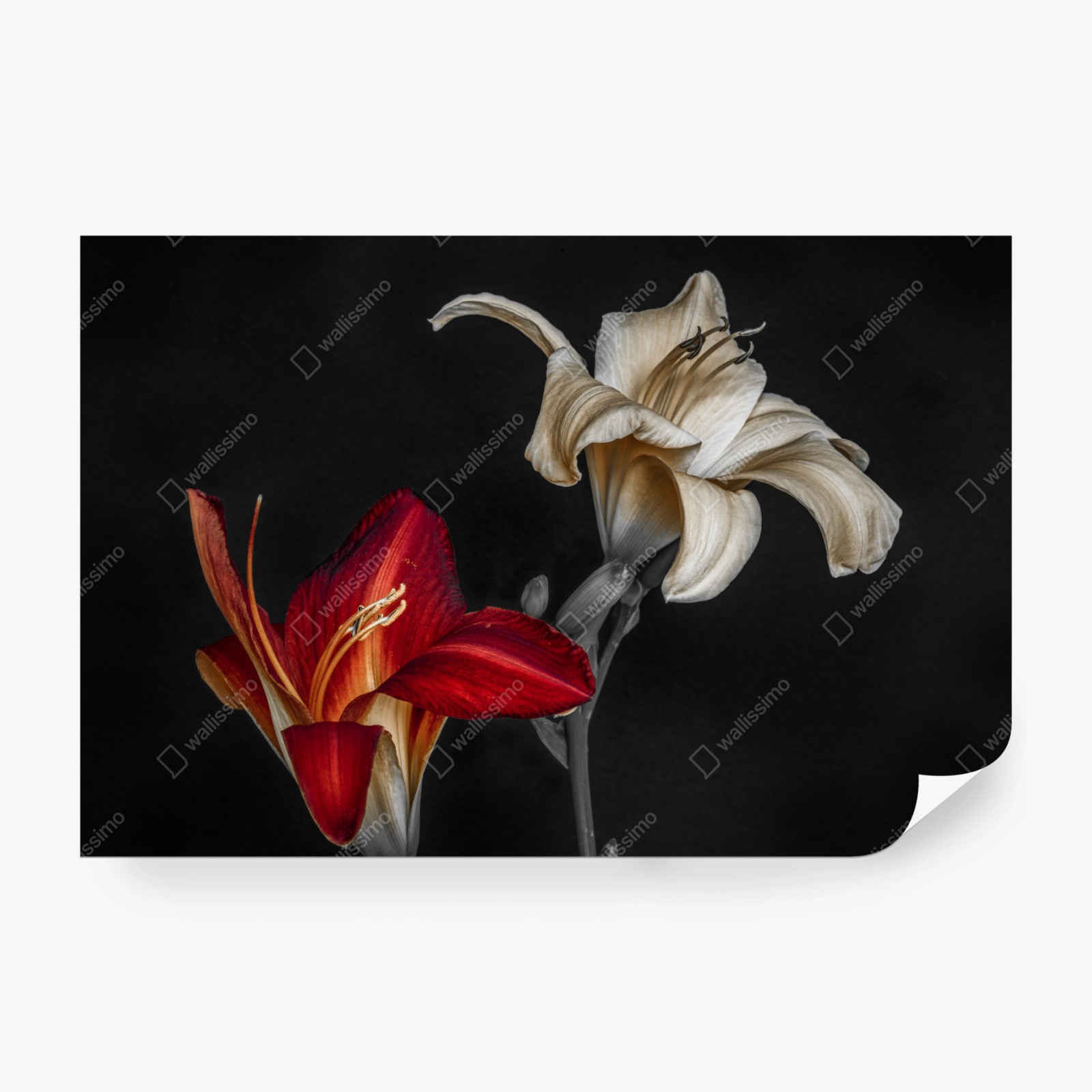 Verleihen Sie Ihrem Raum Eleganz mit einer eindrucksvollen Nahaufnahme roter und cremefarbener Lilien vor tiefschwarzem Hintergrund, ideal für moderne, minimalistische Einrichtungen.MehrWeniger
