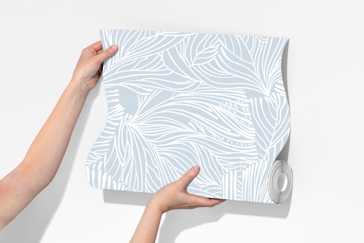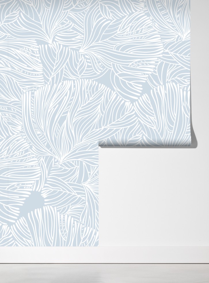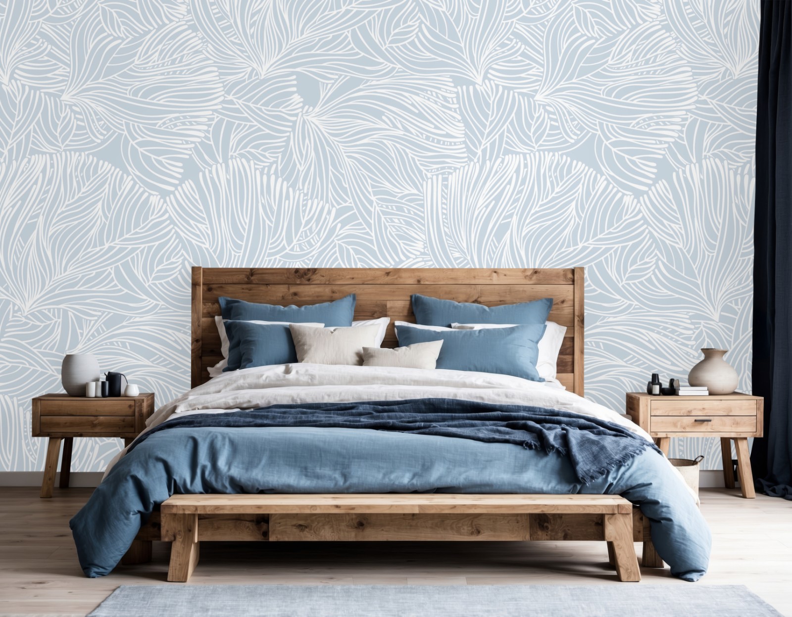 Sanftes pastell-botanisches Muster in Blau und Weiß verleiht jedem Raum dezente Struktur und eine ruhige Atmosphäre.