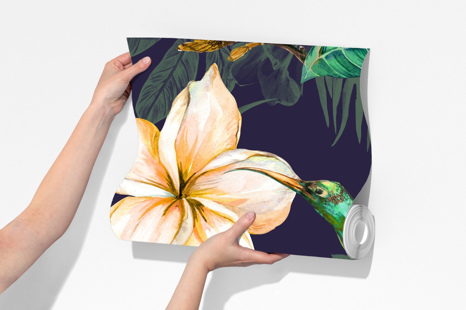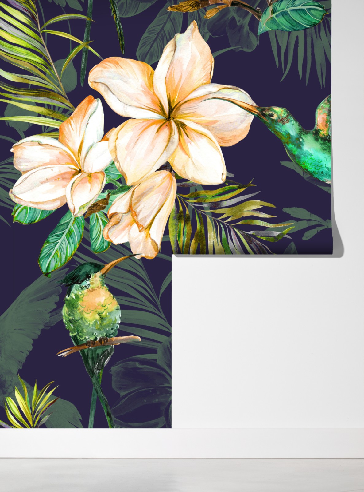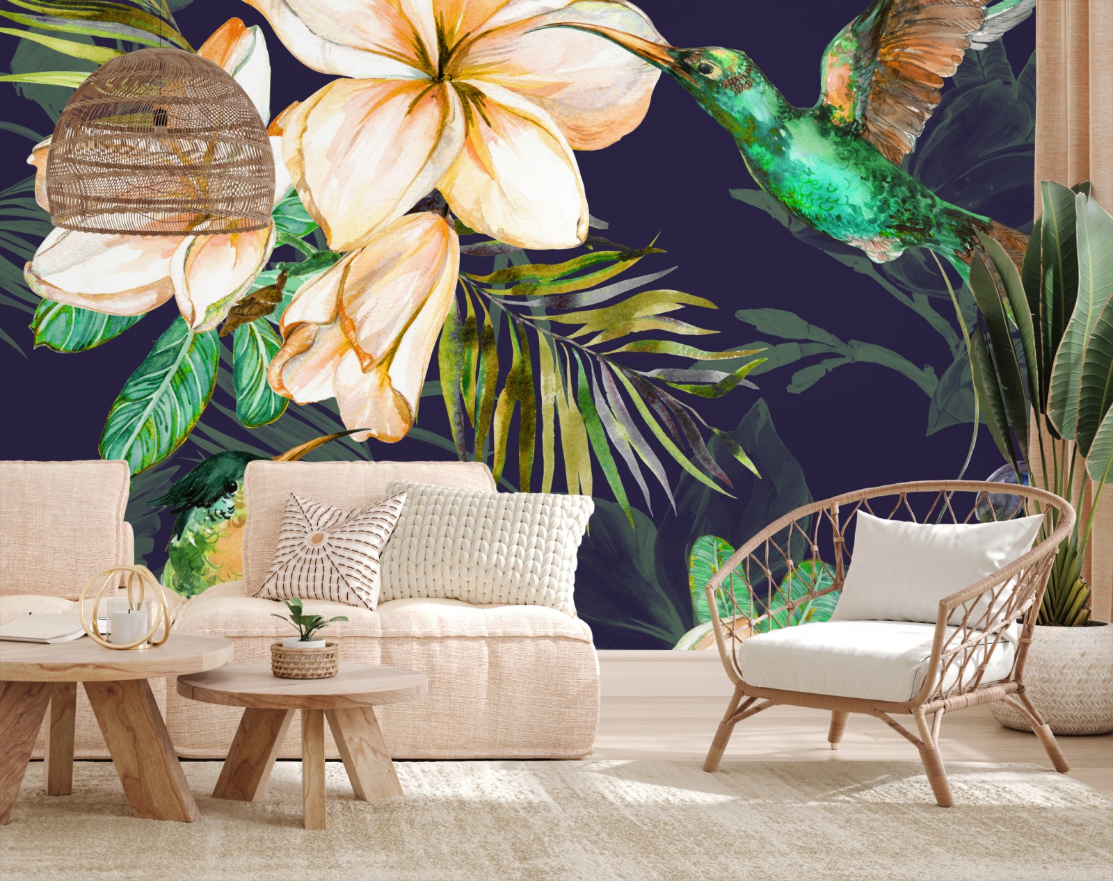 Bringen Sie tropisches Flair in Ihr Zuhause mit handgemalten Kolibris und Plumeria in lebendigen Aquarelltönen.