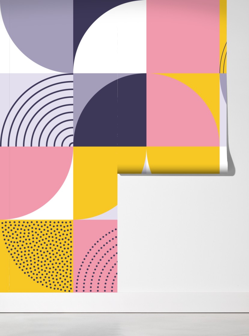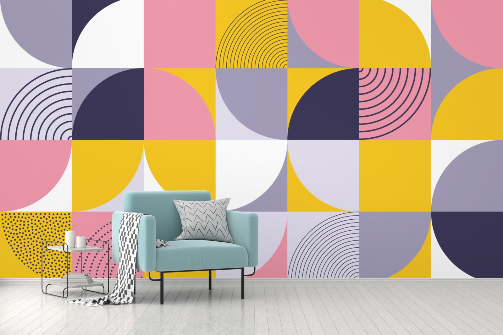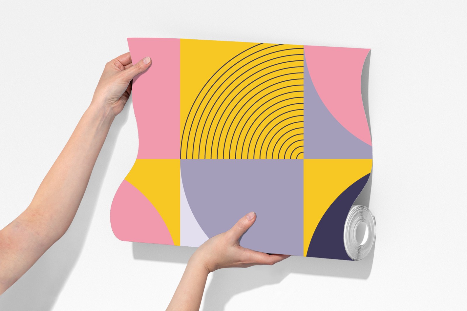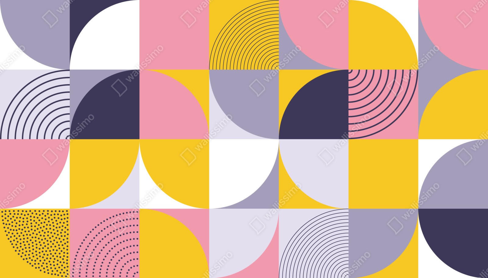 Bringen Sie mit diesem pastellfarbenen geometrischen Muster in Rosa, Gelb und Violett frischen Schwung in Ihr Zuhause, perfekt für moderne Einrichtungen.