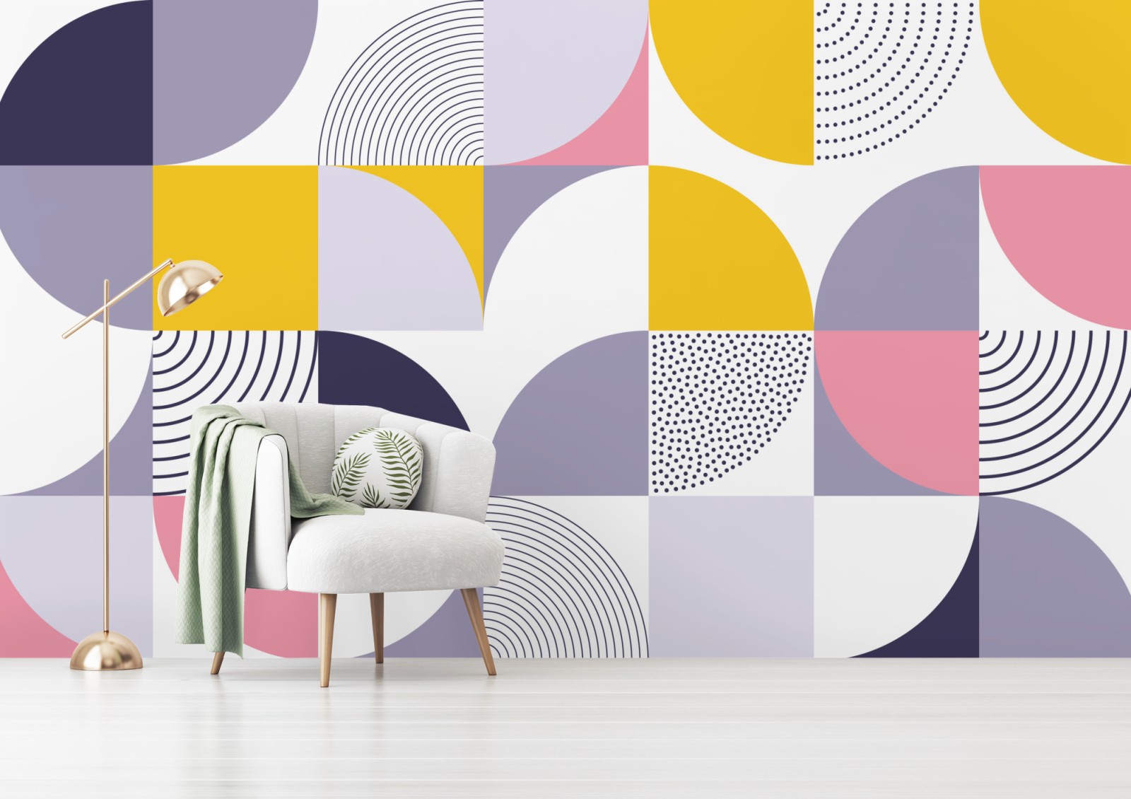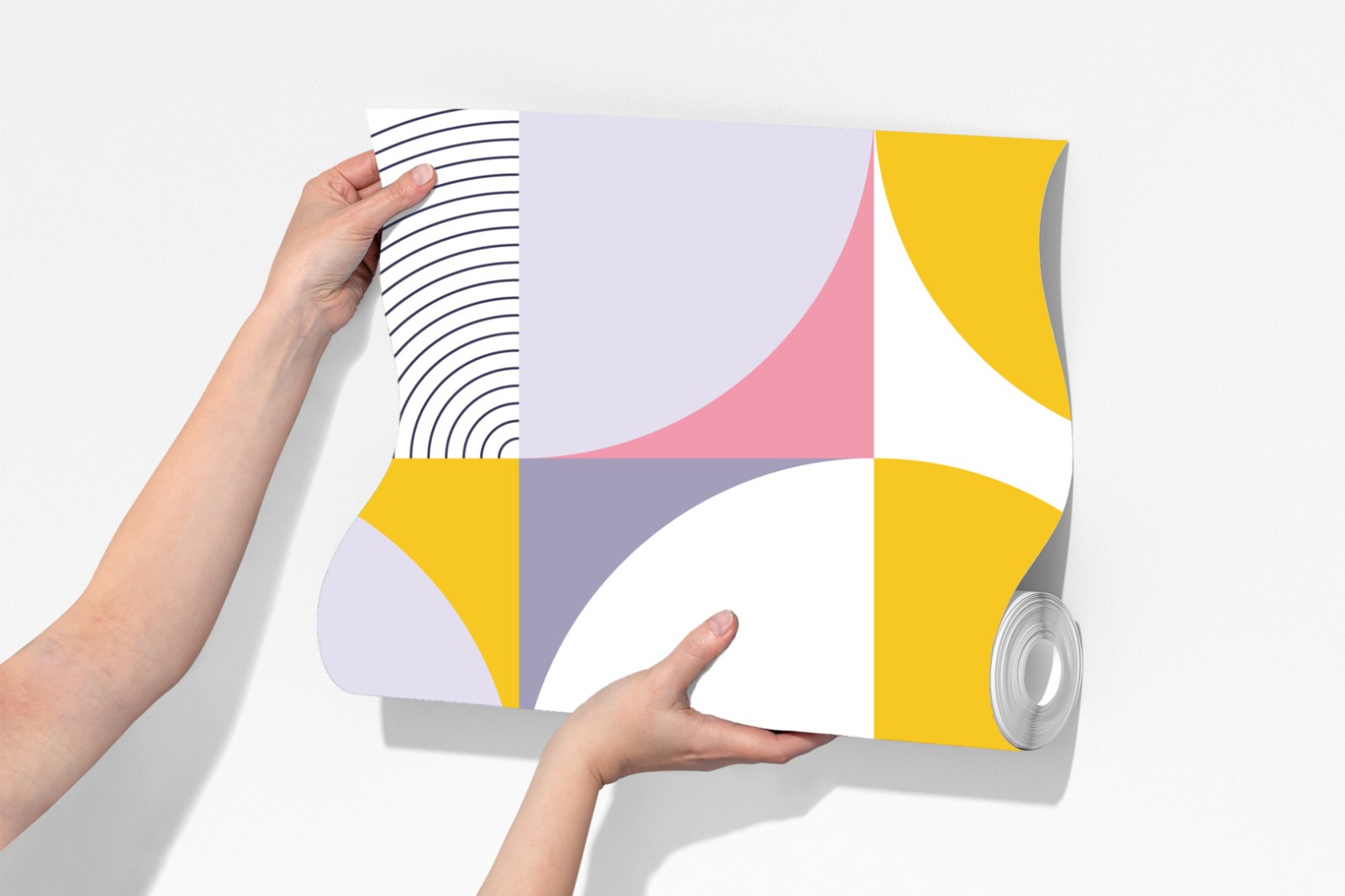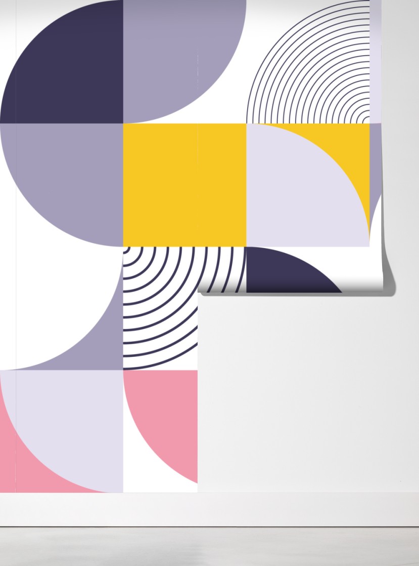Verleihen Sie Ihren Wänden modernen Charme mit diesem pastellfarbenen, geometrischen Design, das zarte Lavendel- und Rosatöne mit gelben Akzenten kombiniert.
