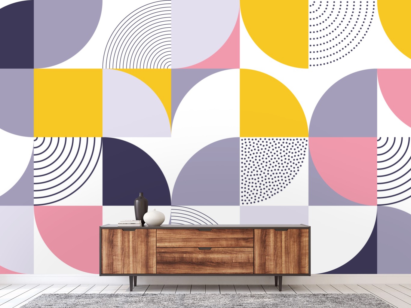 Verleihen Sie Ihren Wänden modernen Charme mit diesem pastellfarbenen, geometrischen Design, das zarte Lavendel- und Rosatöne mit gelben Akzenten kombiniert.MehrWeniger