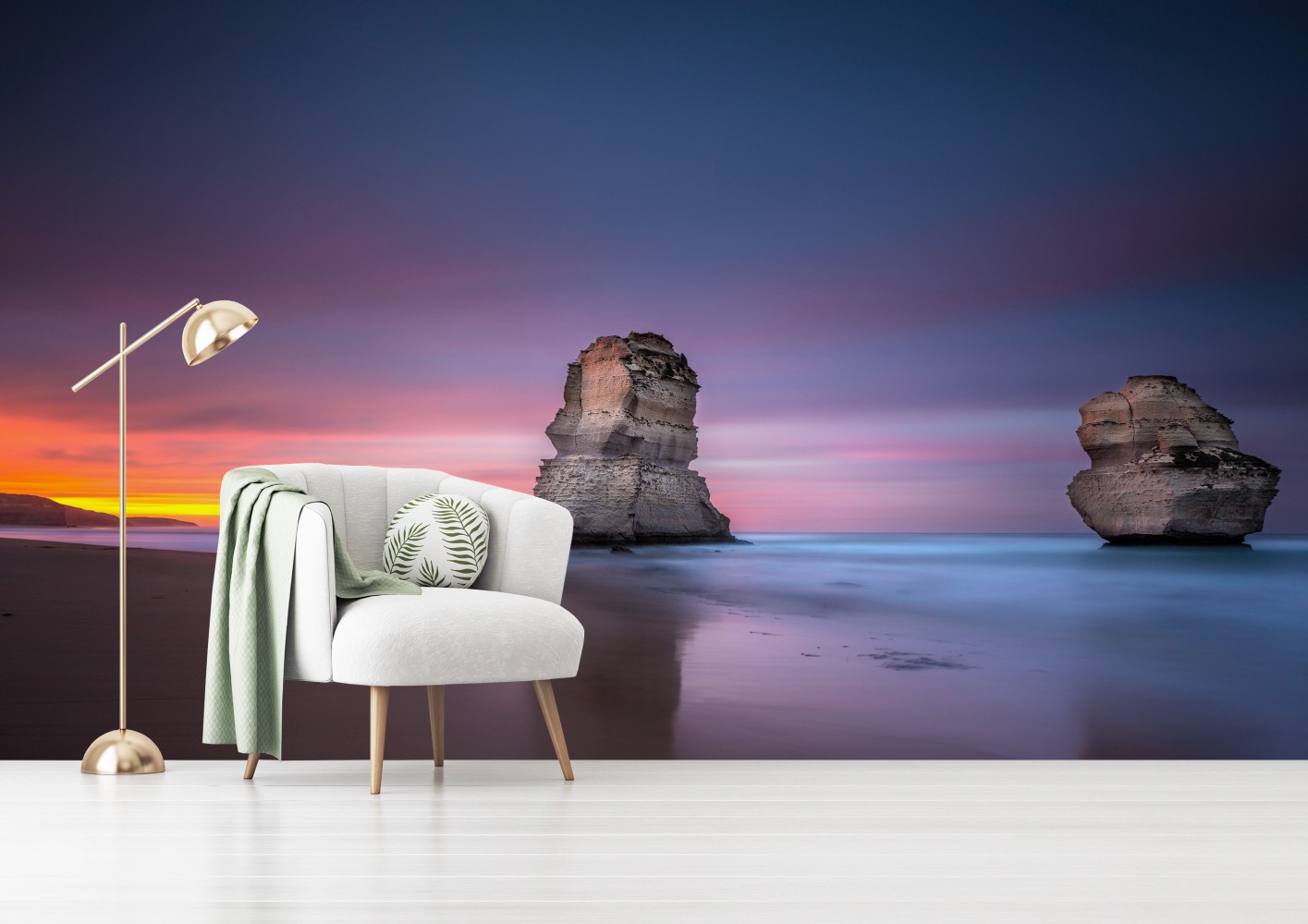 Fototapete Ruhige küstenlandschaft mit felsformationen bei sonnenuntergang