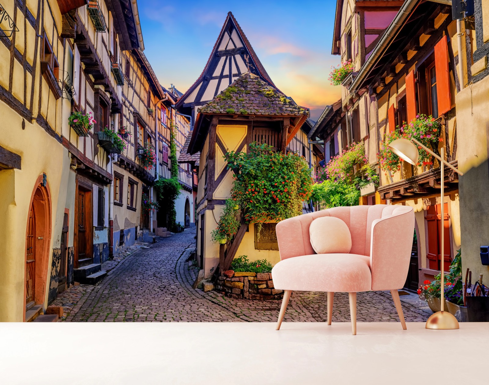 Bringen Sie den romantischen Charme der bunten Fachwerkhäuser von Eguisheim in Ihr Zuhause mit dieser lebendigen Dorfstraße.MehrWeniger