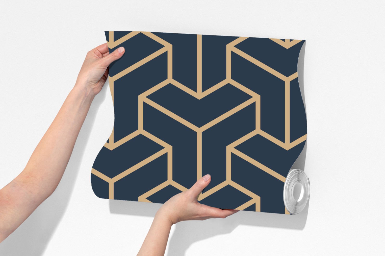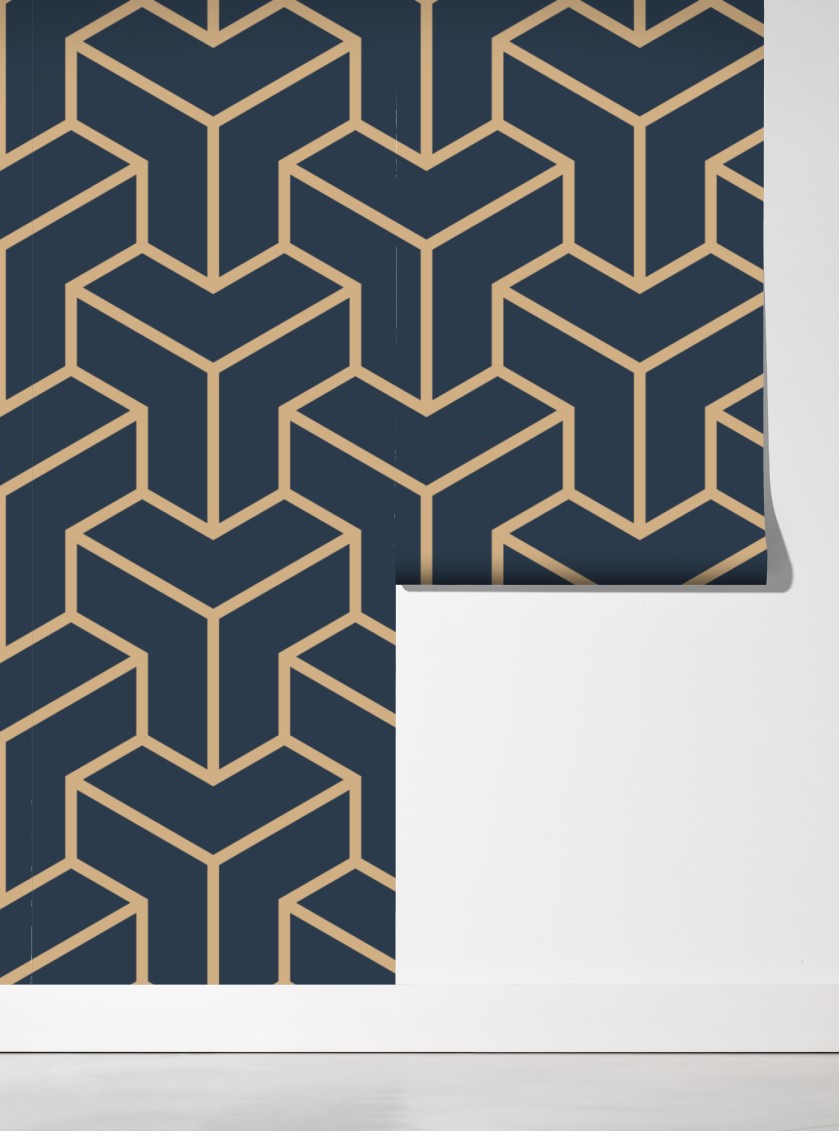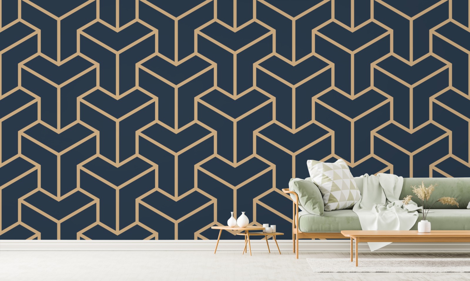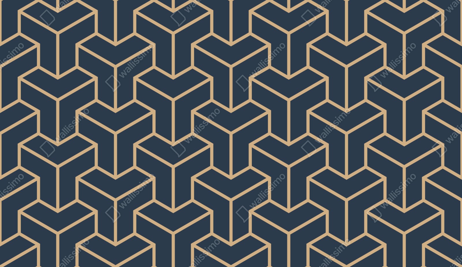 Verleihen Sie Ihrem Raum Tiefe und Eleganz mit einem markanten marineblau-goldenen geometrischen Muster.