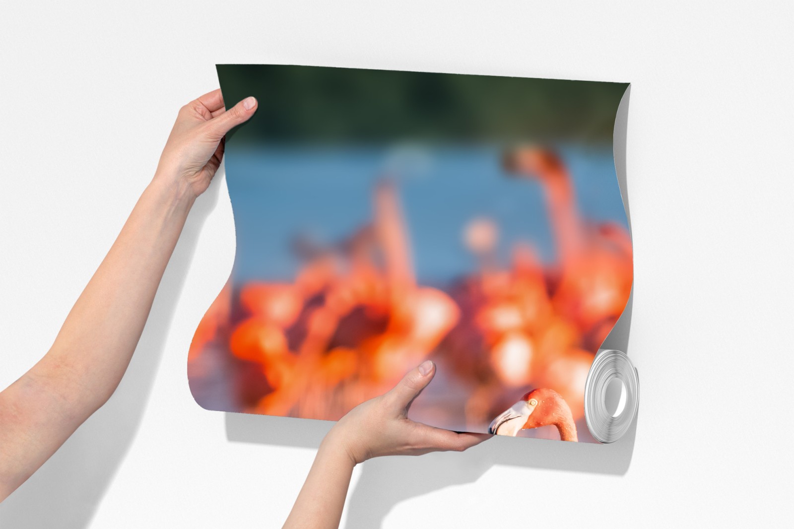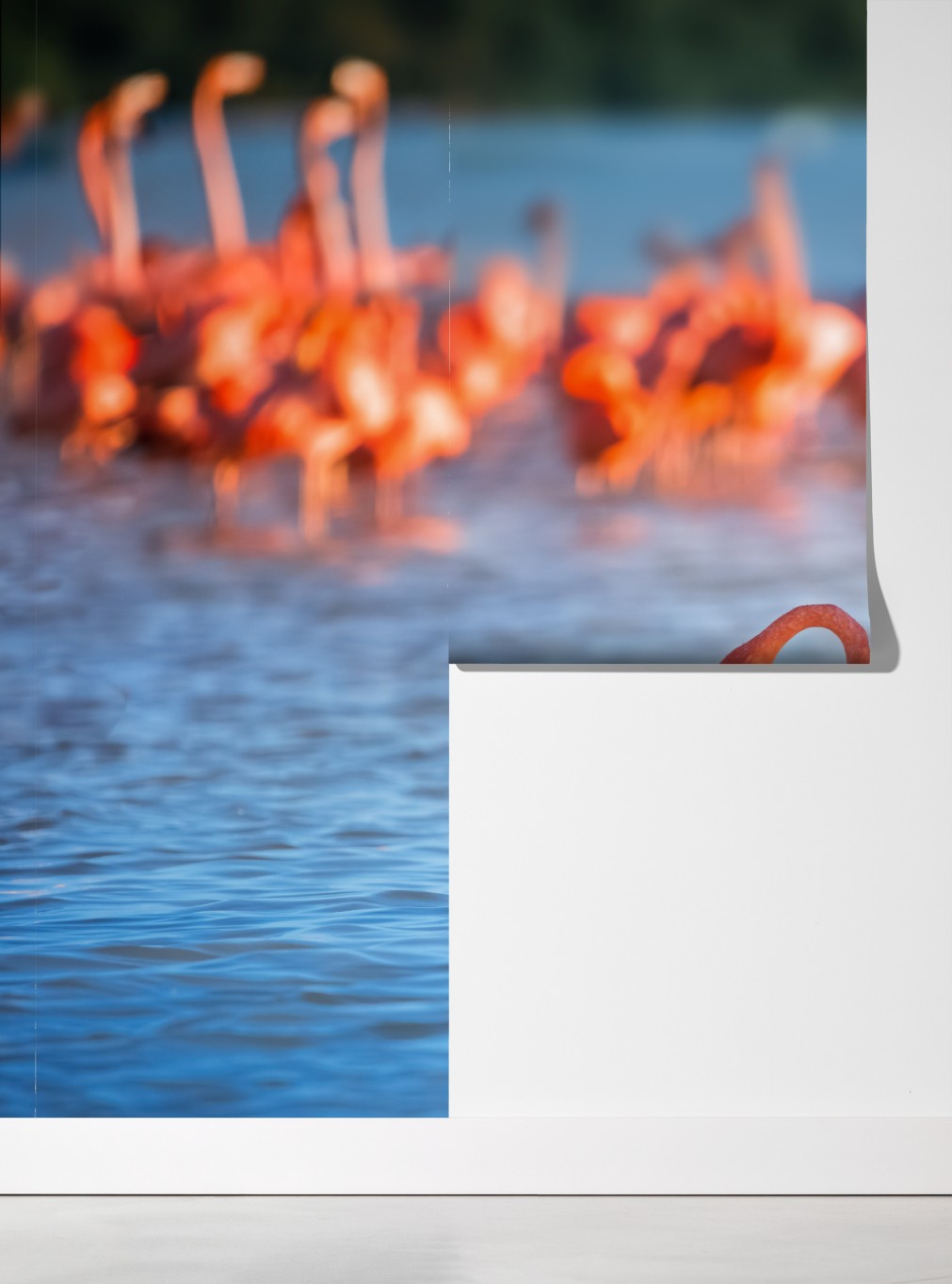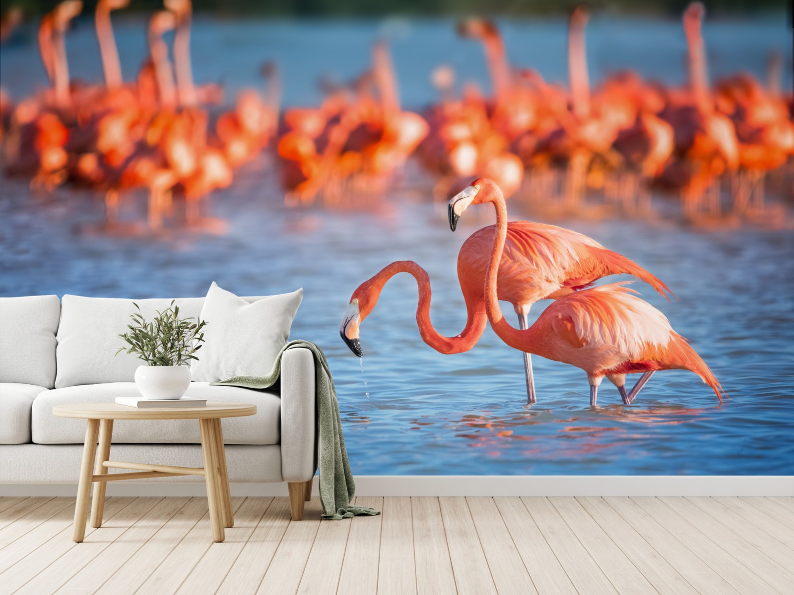 Bringen Sie tropische Farbintensität in Ihr Zuhause mit einem eindrucksvollen Foto von Flamingos, die im ruhigen blauen Wasser stehen.
