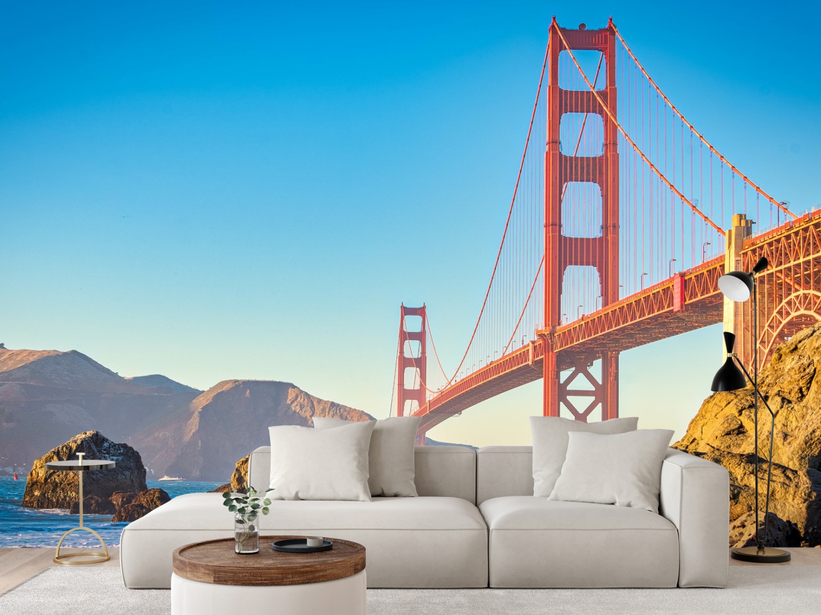 Verleiht jedem Raum urbanen Küstenflair mit dem ikonischen Golden Gate Bridge im warmen Licht und klarem blauem Himmel.
