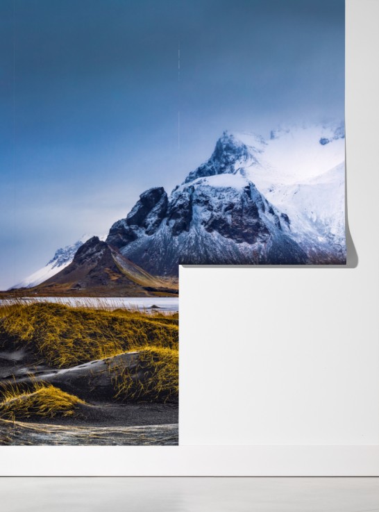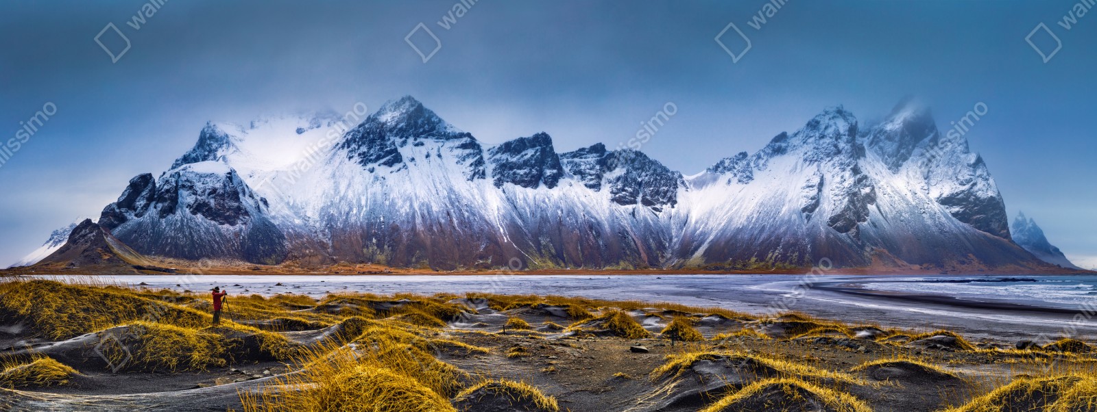 Bringen Sie die dramatische Küste Islands in Ihr Zuhause mit diesem Panorama von Vestrahorn bei Stokksnes, das schneebedeckte Gipfel, schwarzen Sand und windgepeitschte Dünen zeigt.