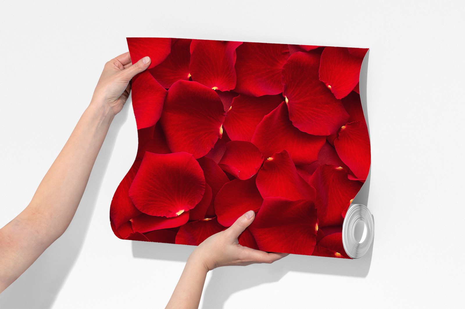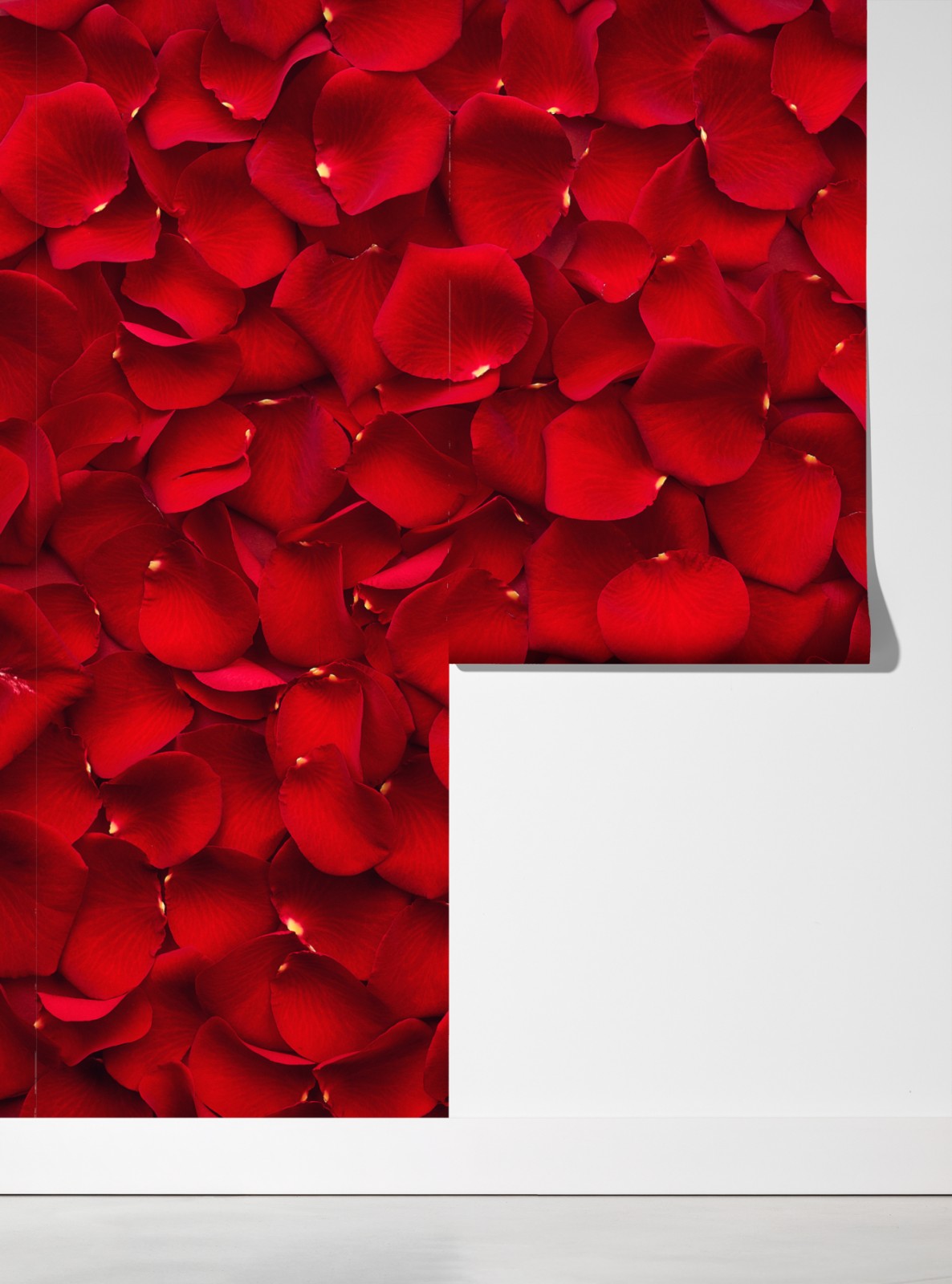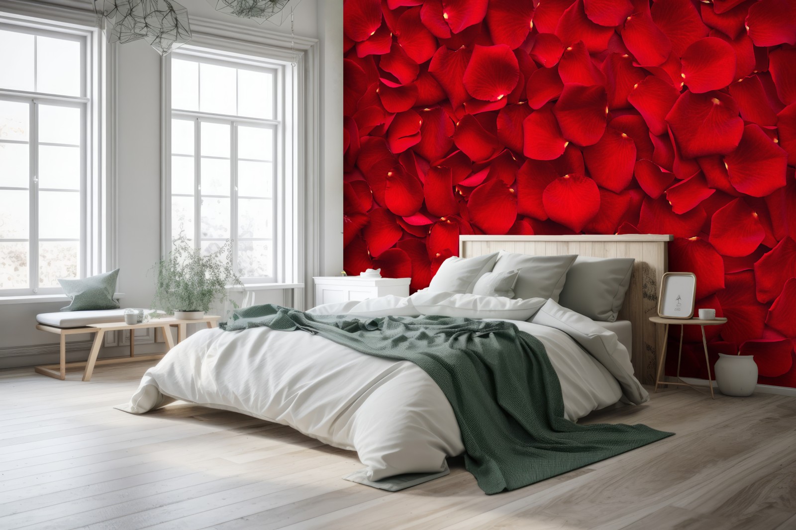 Verleihen Sie Ihrem Raum romantische Eleganz mit einer Nahaufnahme roter Rosenblätter, perfekt für eine warme und intime Atmosphäre.