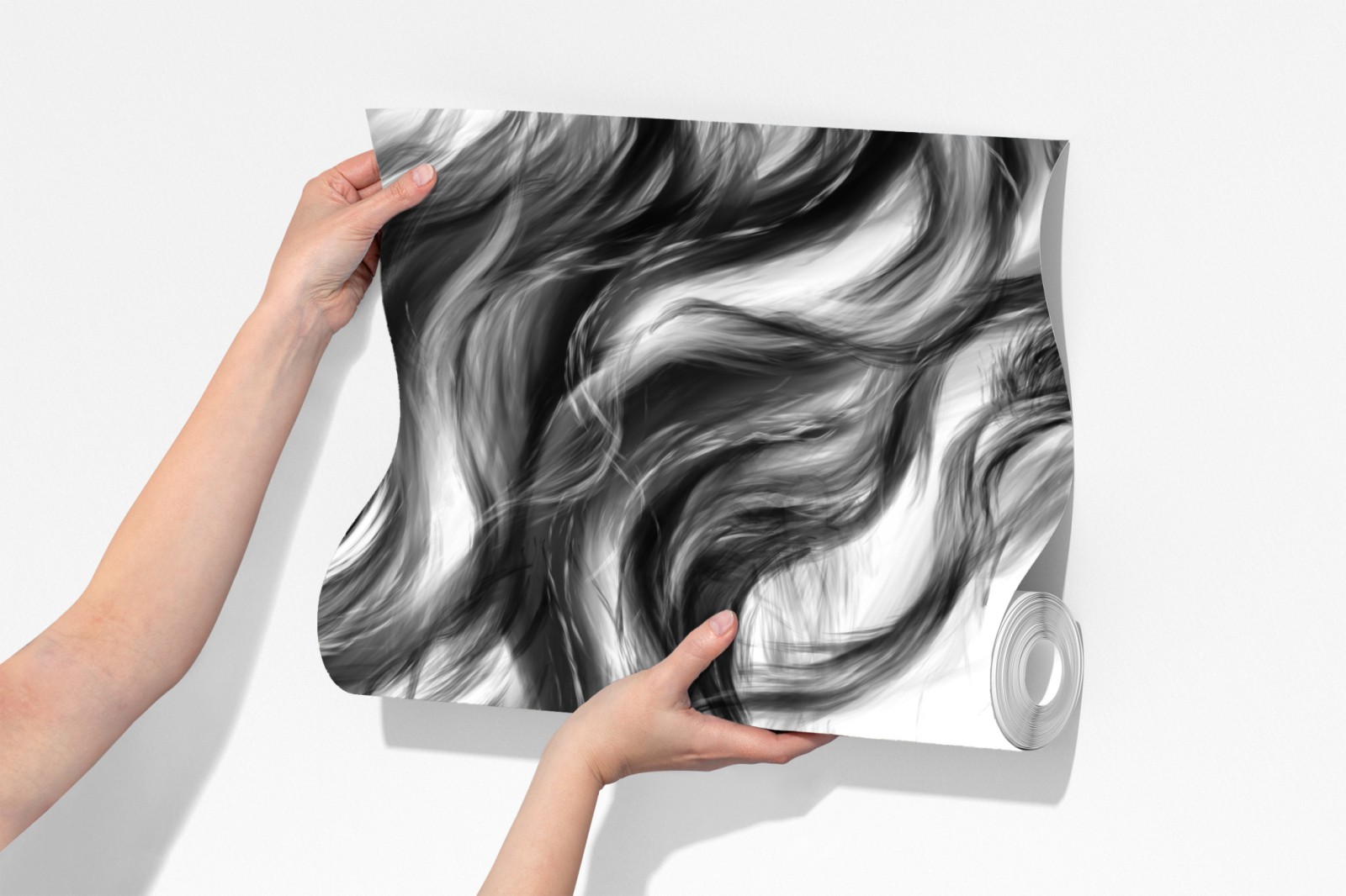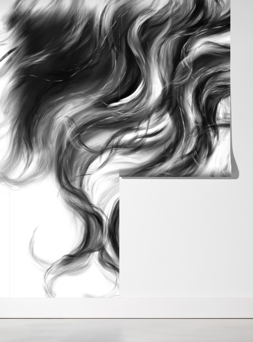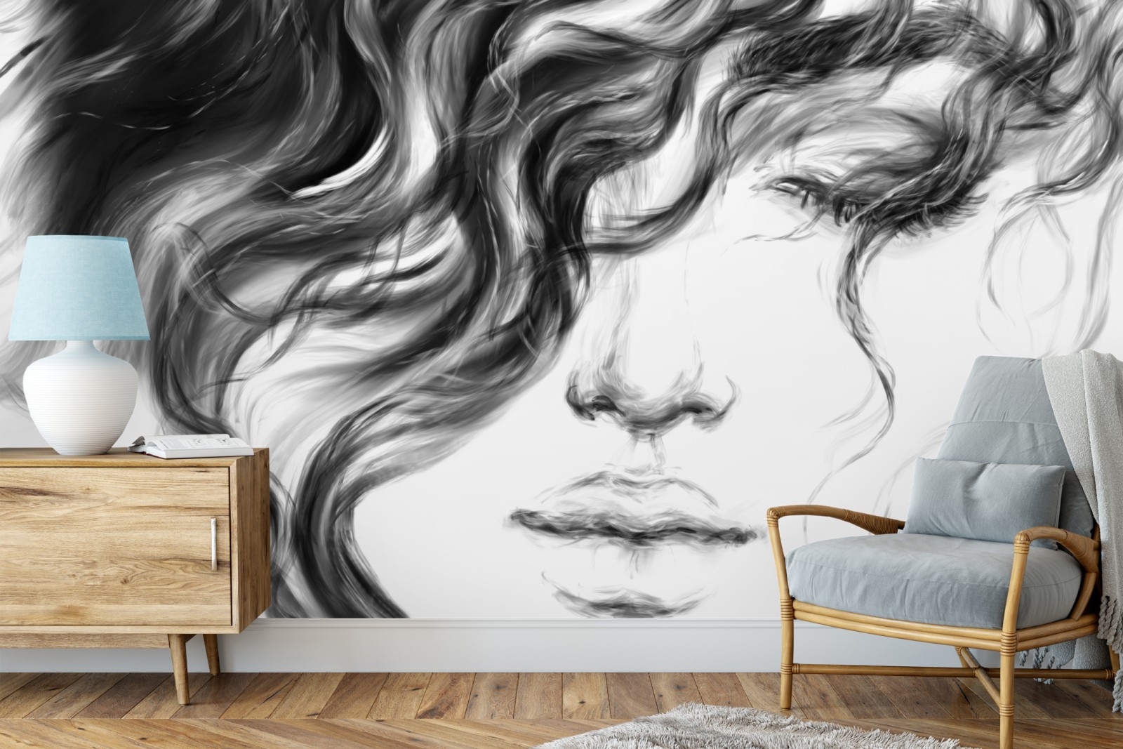 Elegante monochrome Skizze eines Frauenporträts mit fließendem Haar, ideal für moderne und minimalistische Räume.