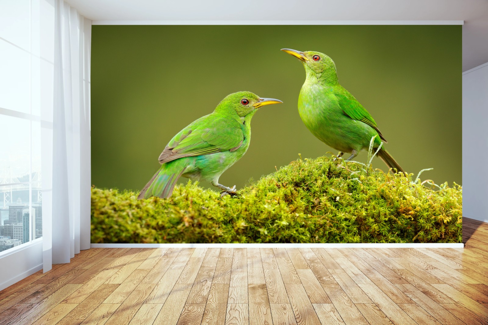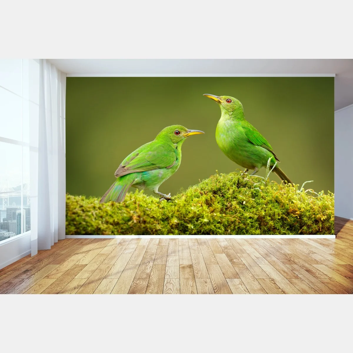 Atemberaubende Nahaufnahme von zwei grünen Honigfressern auf Moos, die tropische Farbtiefe und natürliche Ruhe in Ihren Raum bringen.MehrWeniger