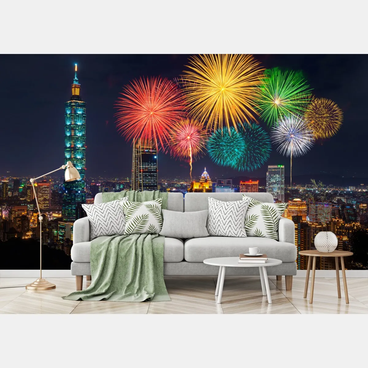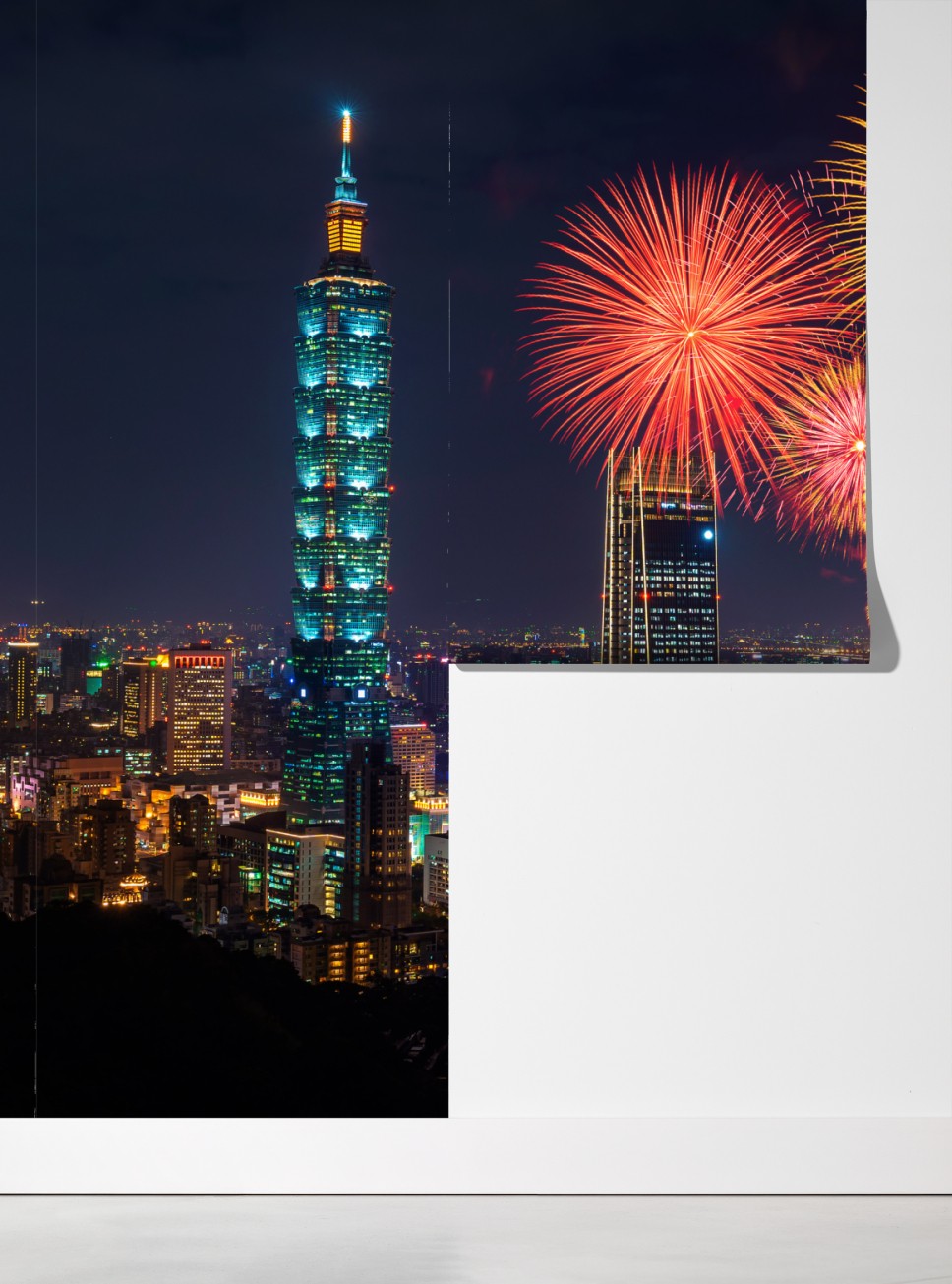 Leuchtende Feuerwerke erhellen die Skyline von Taipeh und bringen festliche Stimmung und lebendige Farben an jede Wand.