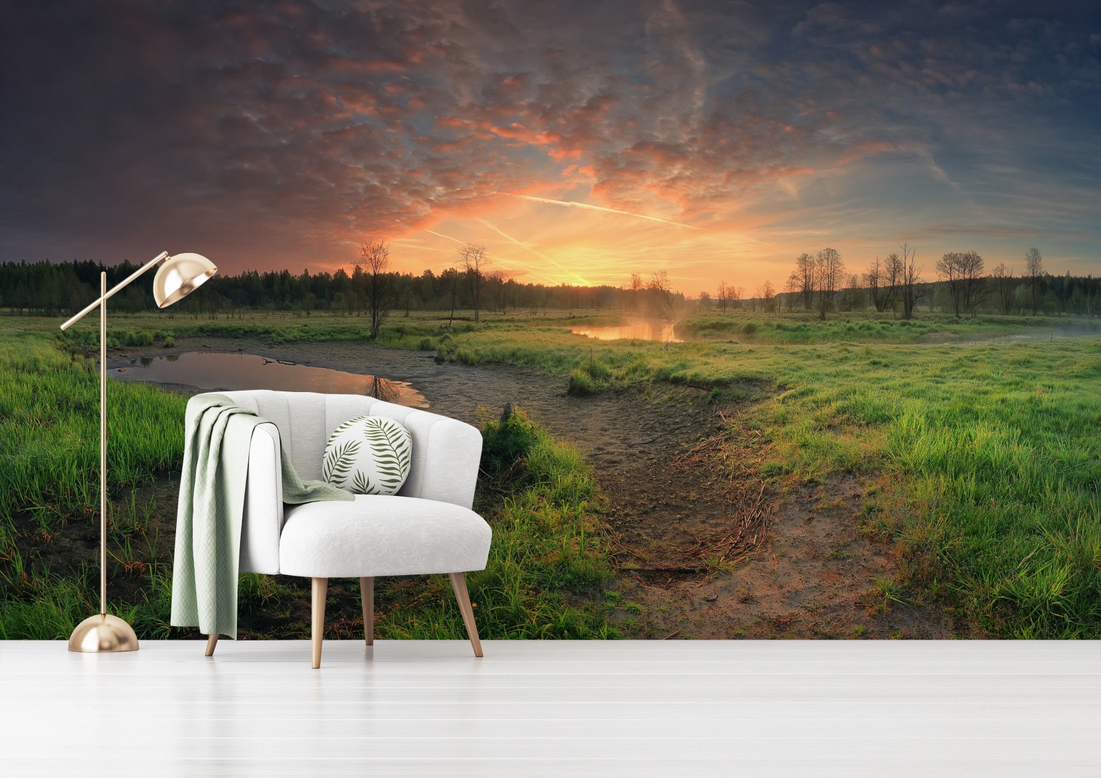 Fototapete Sonnenuntergang über einer ruhigen wiese