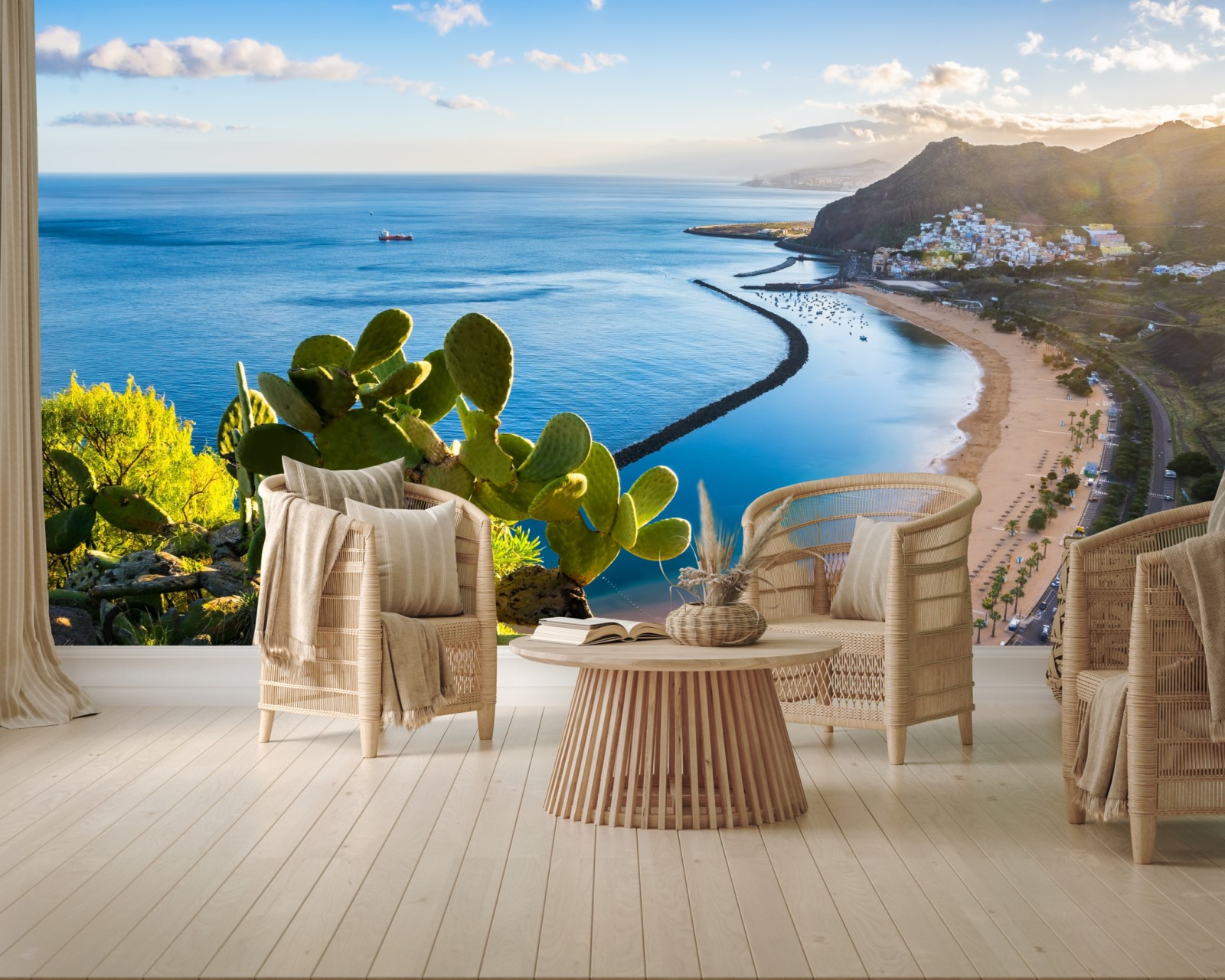 Bringen Sie die ruhige Schönheit des Strandes Las Teresitas in Ihr Zuhause mit diesem lebendigen Küstenpanorama, ideal als entspannender Blickfang in jedem Raum.