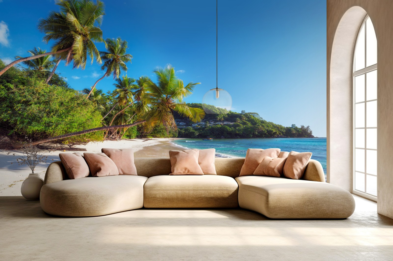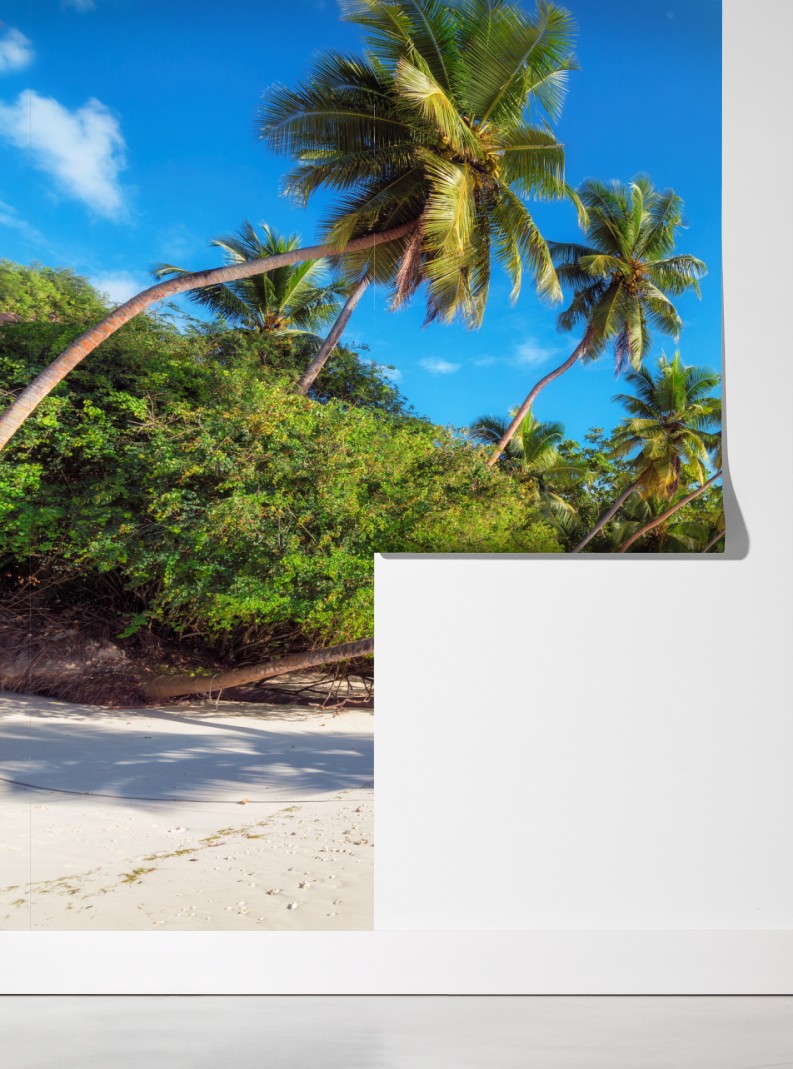 Bringen Sie die Ruhe eines tropischen Strandes in Ihr Zuhause mit türkisfarbenem Wasser und wiegenden Palmen, ideal zur Schaffung einer entspannten Atmosphäre.