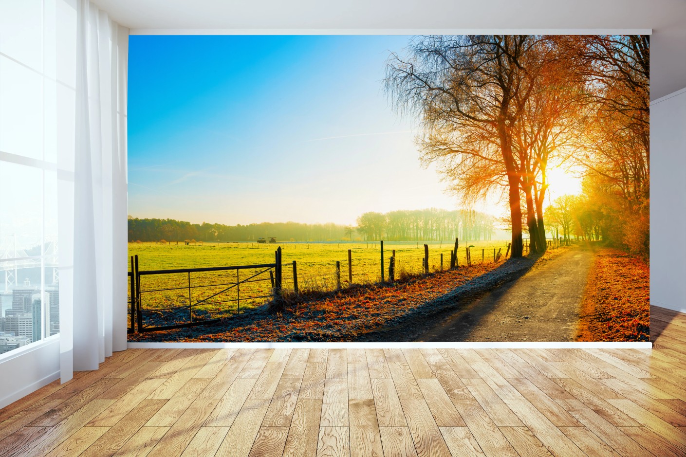 Fototapete Sonnenbeschienener landweg durch herbstliche wiese