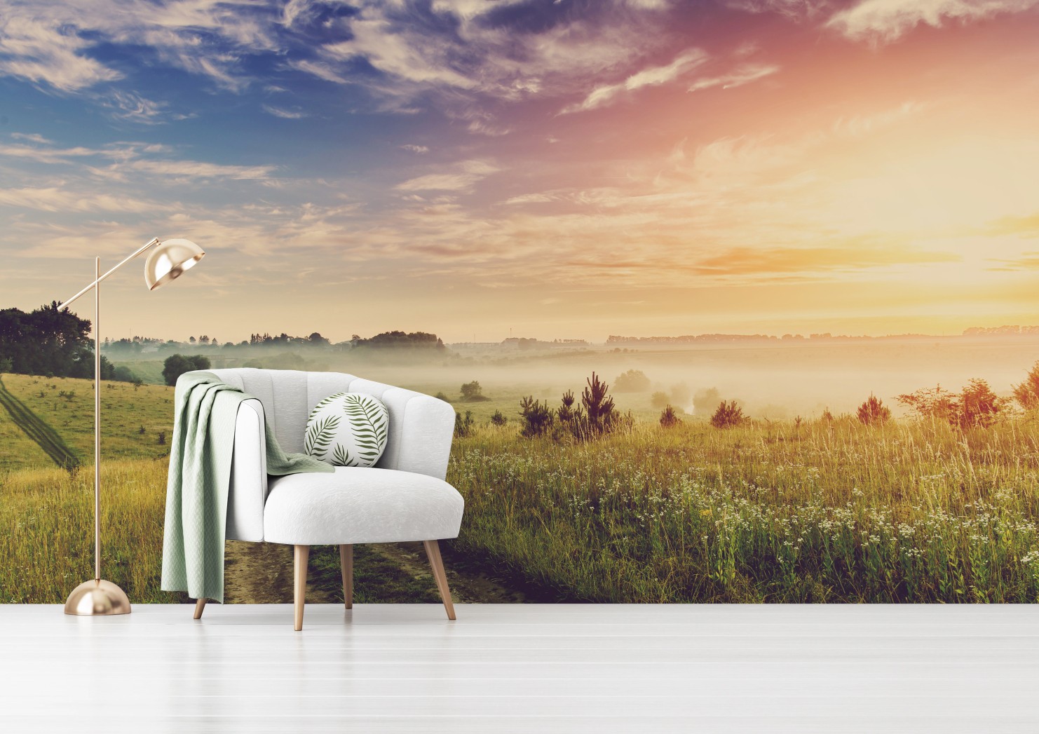 Fototapete Nebeliger sonnenaufgang über einer ländlichen wiese
