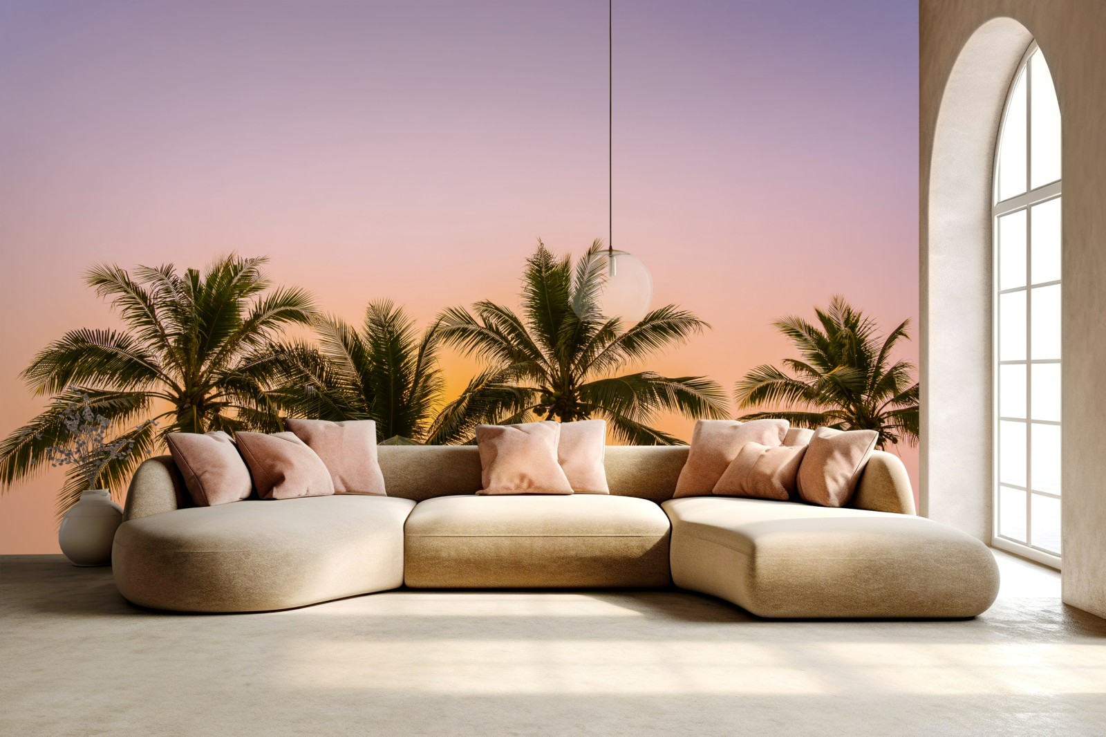 Eine ruhige tropische Strandlandschaft mit Palmen-Silhouetten vor einem farbenfrohen Sonnenuntergangshimmel, ideal zur Schaffung einer entspannenden Küstenatmosphäre.