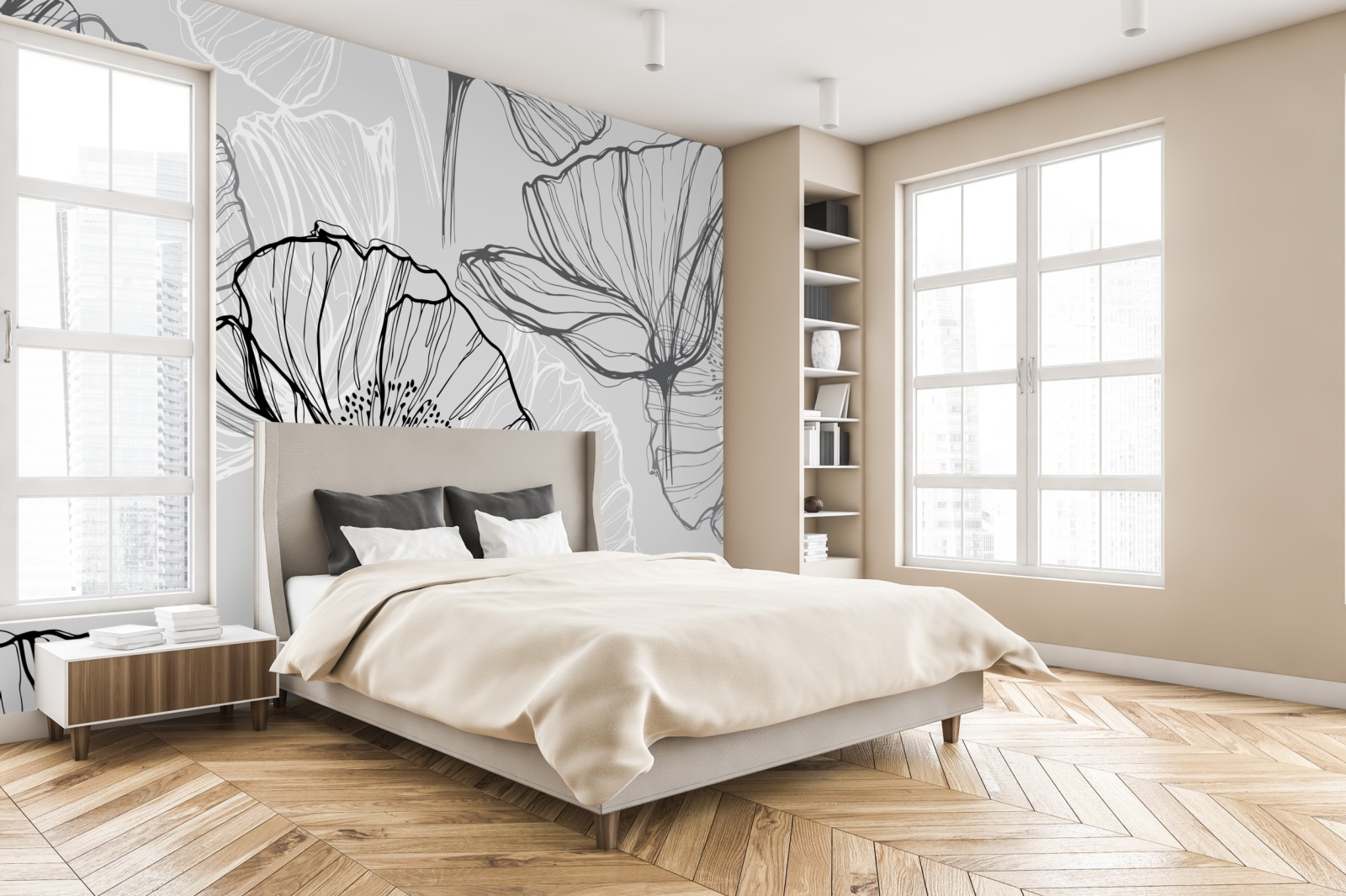 Elegante Graustufen-Mohnillustration verleiht jedem Raum subtile botanische Eleganz und passt ideal zu modernen und minimalistischen Einrichtungsstilen.