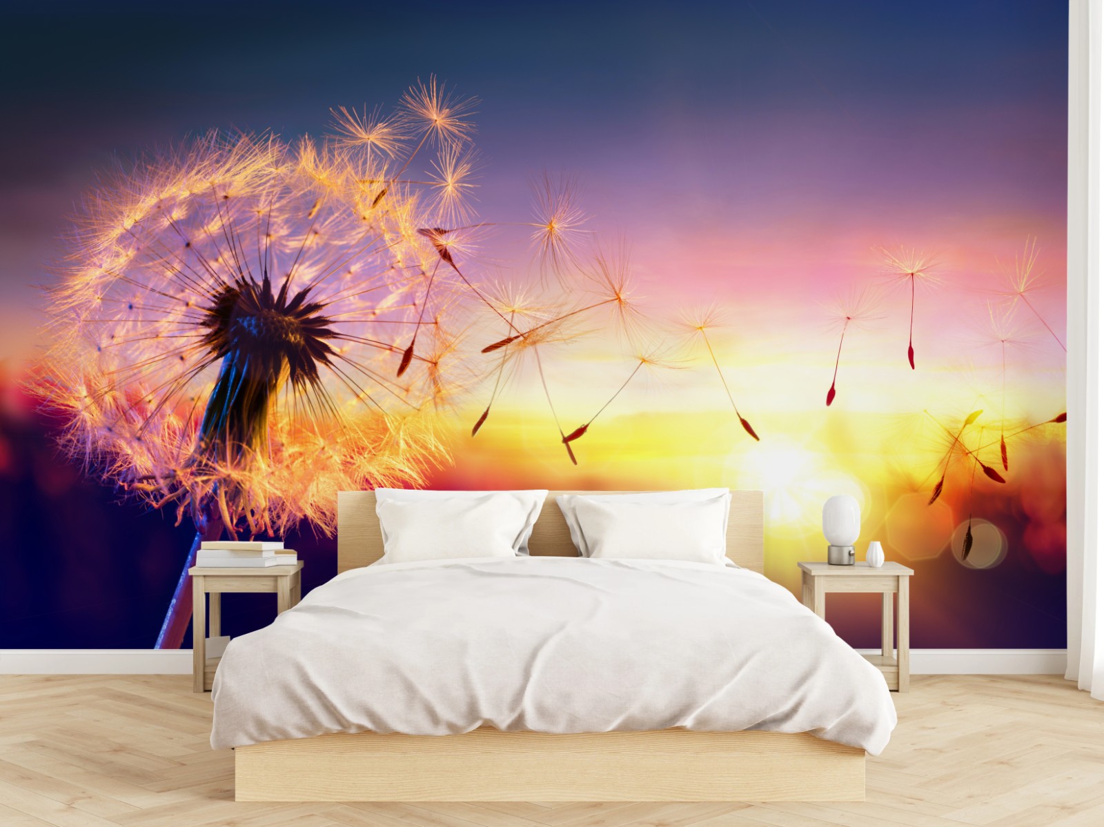 Fototapete Goldener löwenzahn bei sonnenuntergang