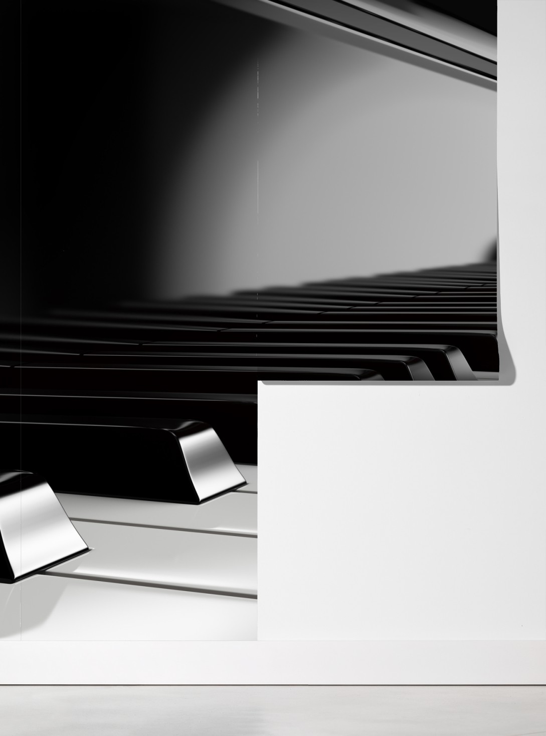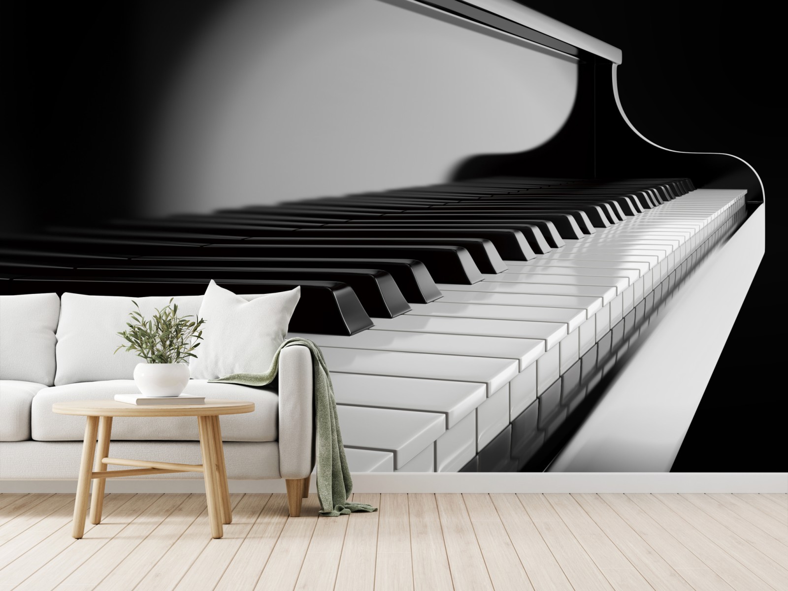 Verleihen Sie Ihrem Raum eine zeitlose musikalische Note mit einer Nahaufnahme von Klaviertasten in Schwarzweiß.