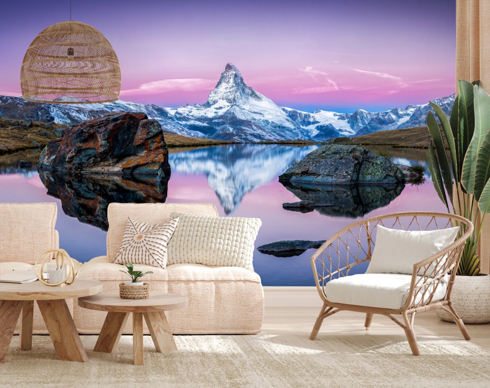 Bringen Sie sanfte alpine Schönheit in Ihr Zuhause mit dieser ruhigen Bergspiegelung und dem zarten Pastellhimmel, ideal für einen entspannenden Blickfang.MehrWeniger