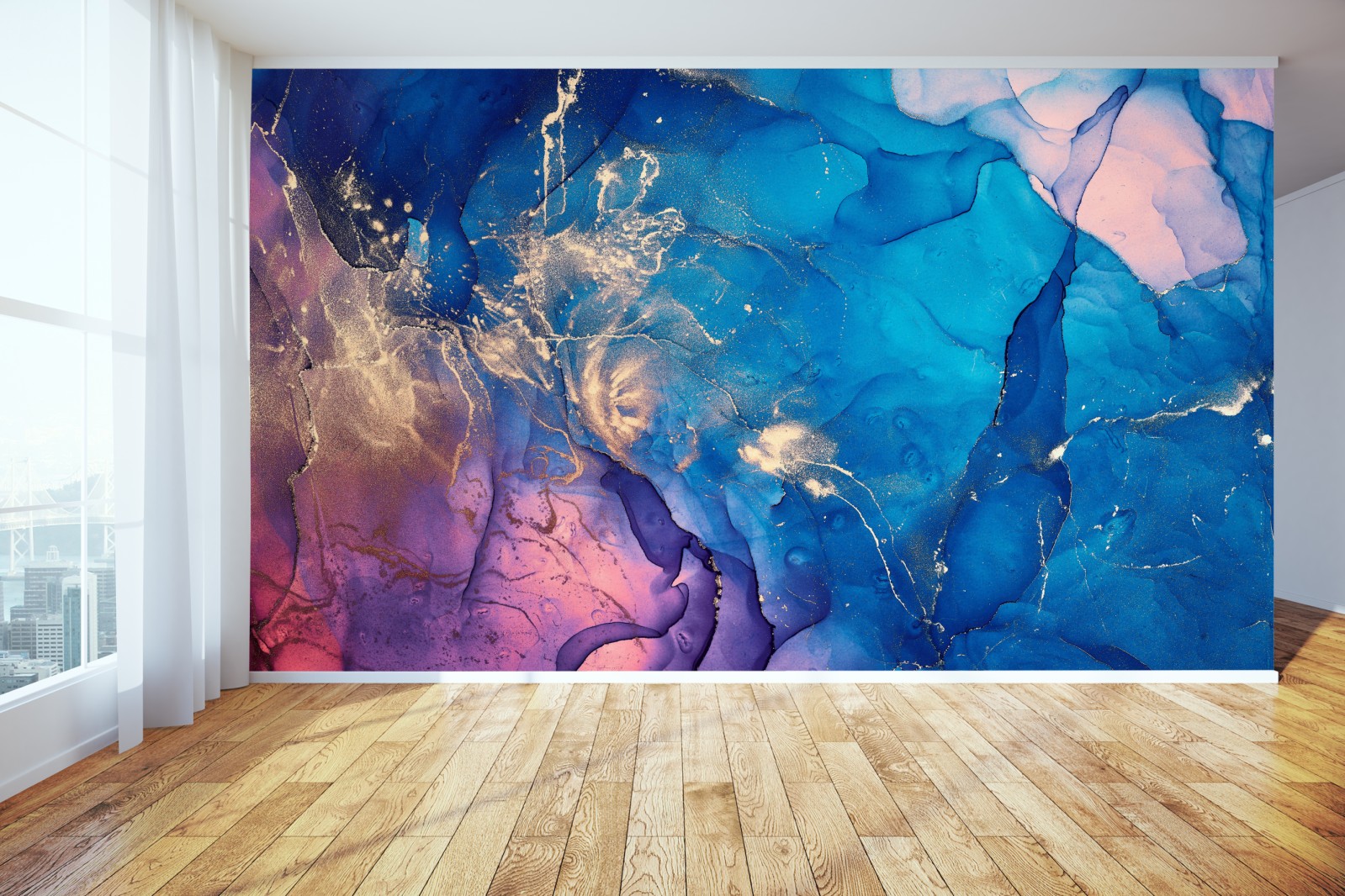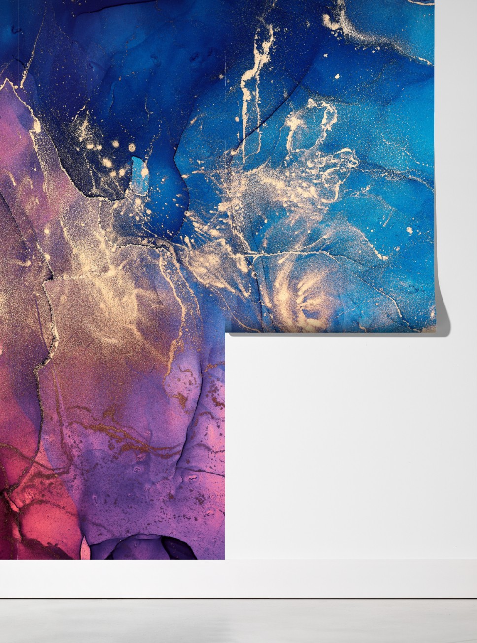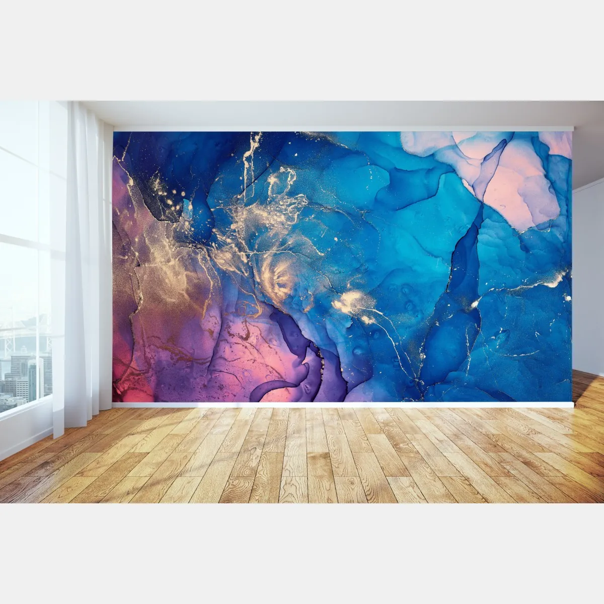 Lebendige Komposition in Blau- und Violetttönen mit goldenen Akzenten schafft eine luxuriöse, marmorähnliche Abstraktion, ideal für moderne Innenräume.
