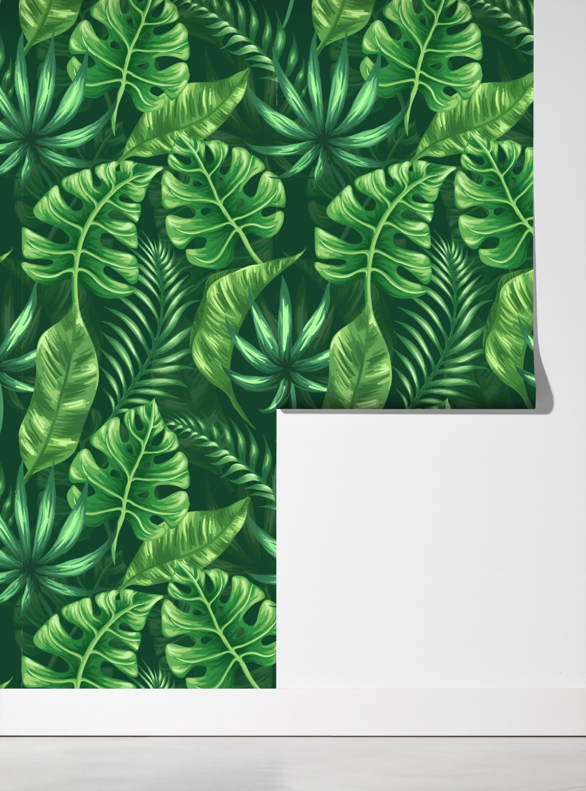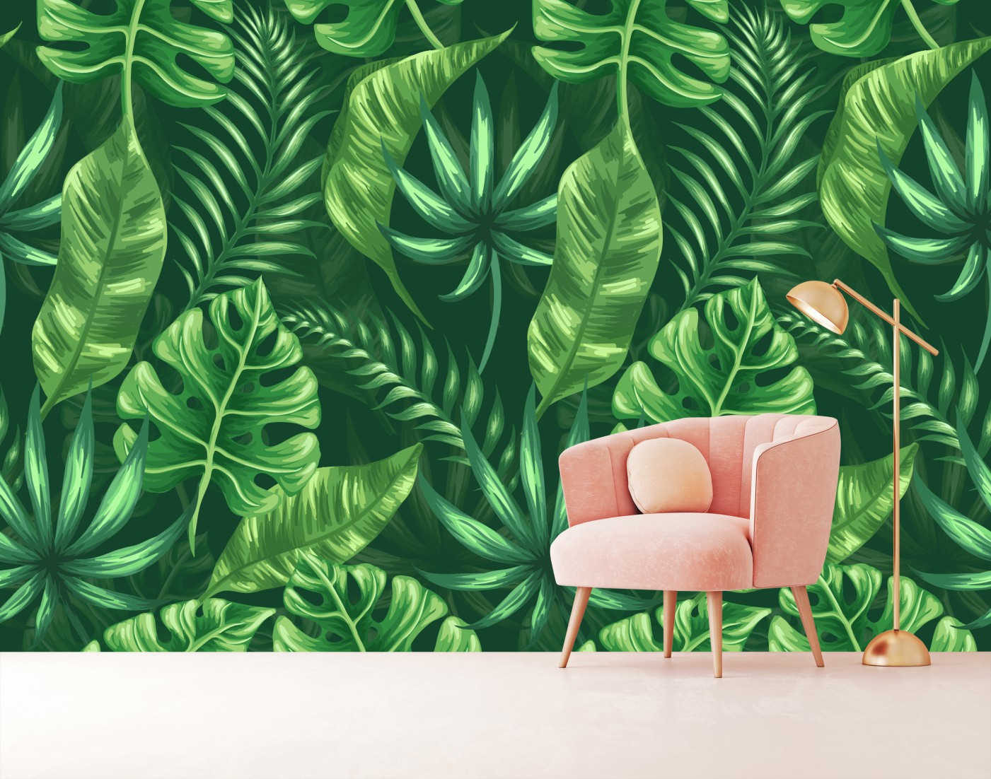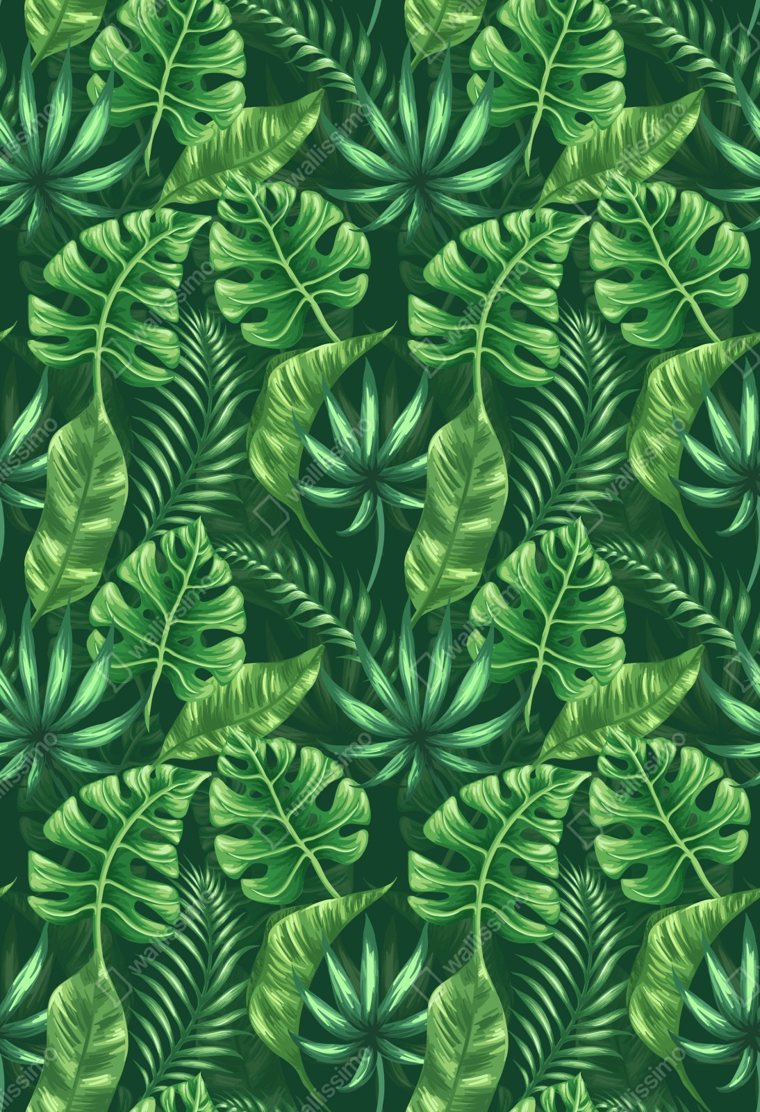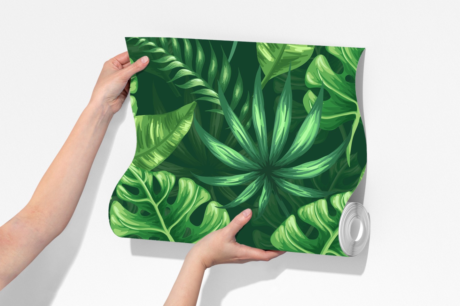 Bringen Sie tropisches Flair in Ihr Zuhause mit diesem nahtlosen Muster aus grünen Palmblättern, ideal zur Schaffung einer beruhigenden botanischen Atmosphäre.