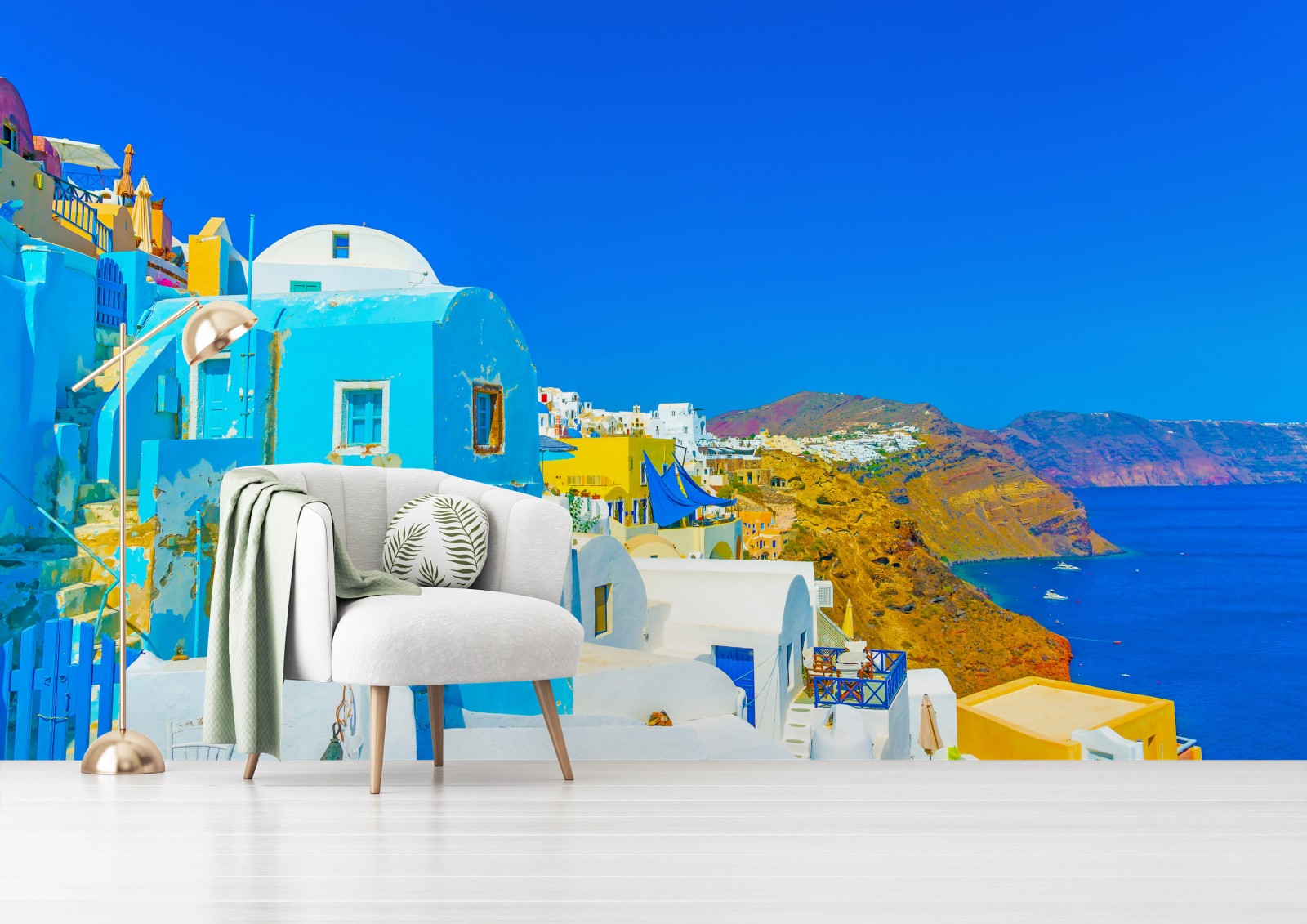 Bringen Sie den ikonischen Blick auf Oia, Santorini in Ihr Zuhause — eine helle Küstenszene voller mediterranem Charme.MehrWeniger