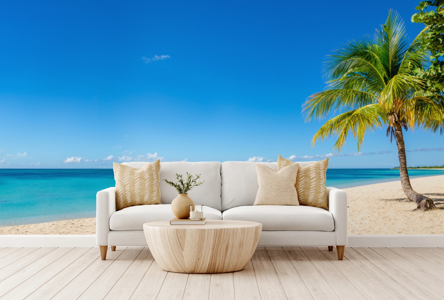 Bringen Sie tropische Ruhe in Ihr Zuhause mit dieser friedlichen Strandaufnahme, einer Palme und türkisblauem Meer.MehrWeniger