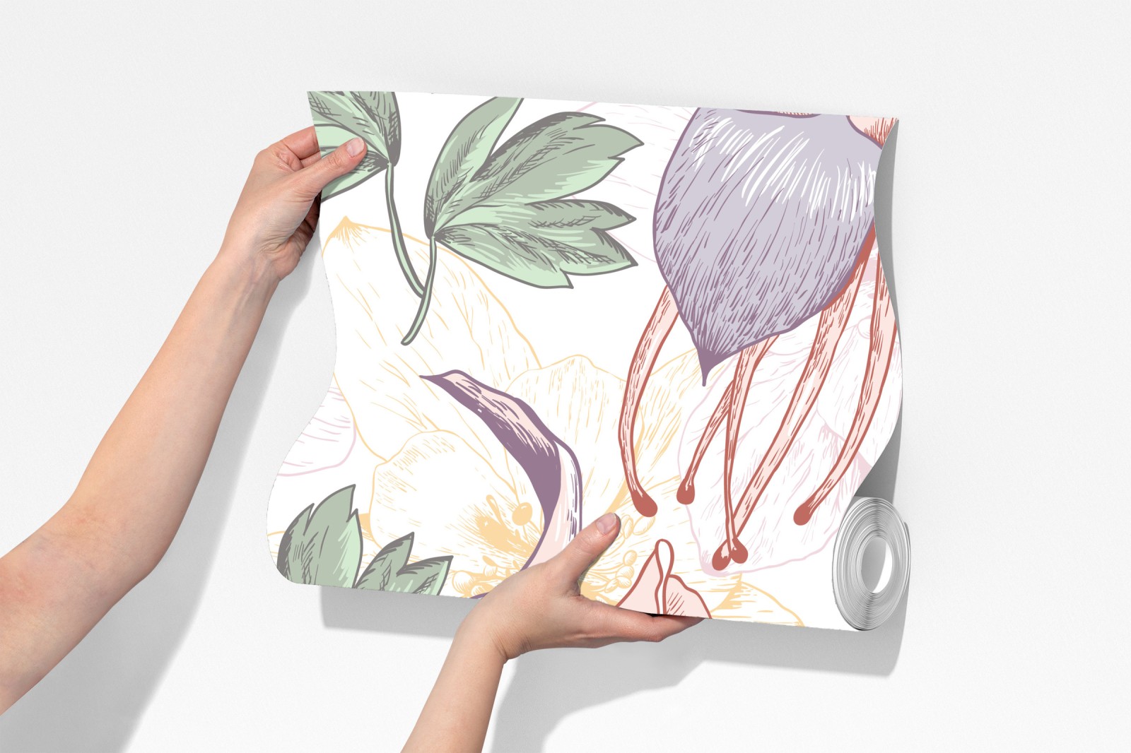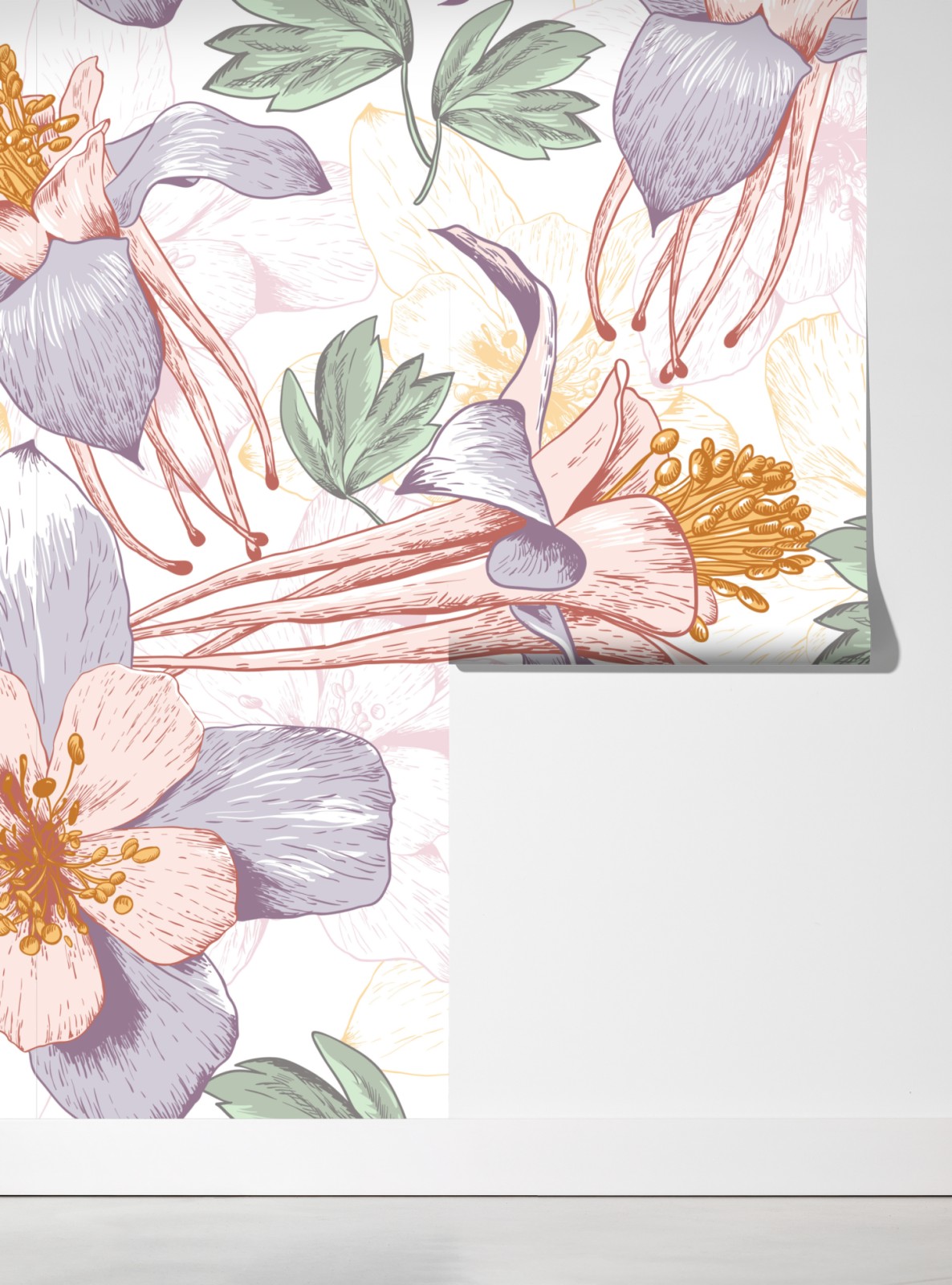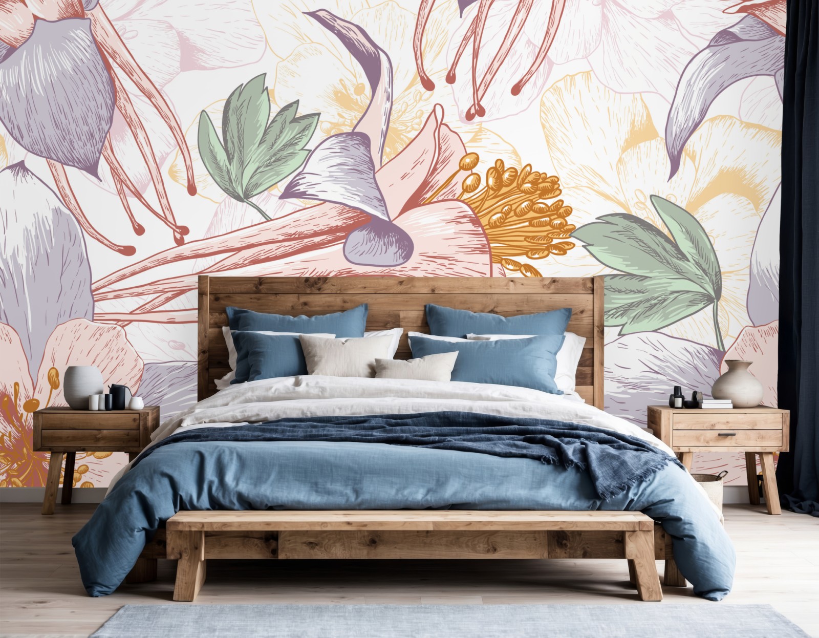 Verleihen Sie Ihrem Raum einen sanften Frühlingscharm mit dieser zarten Pastell-Blumenillustration, ideal für Schlafzimmer und gemütliche Wohnräume.