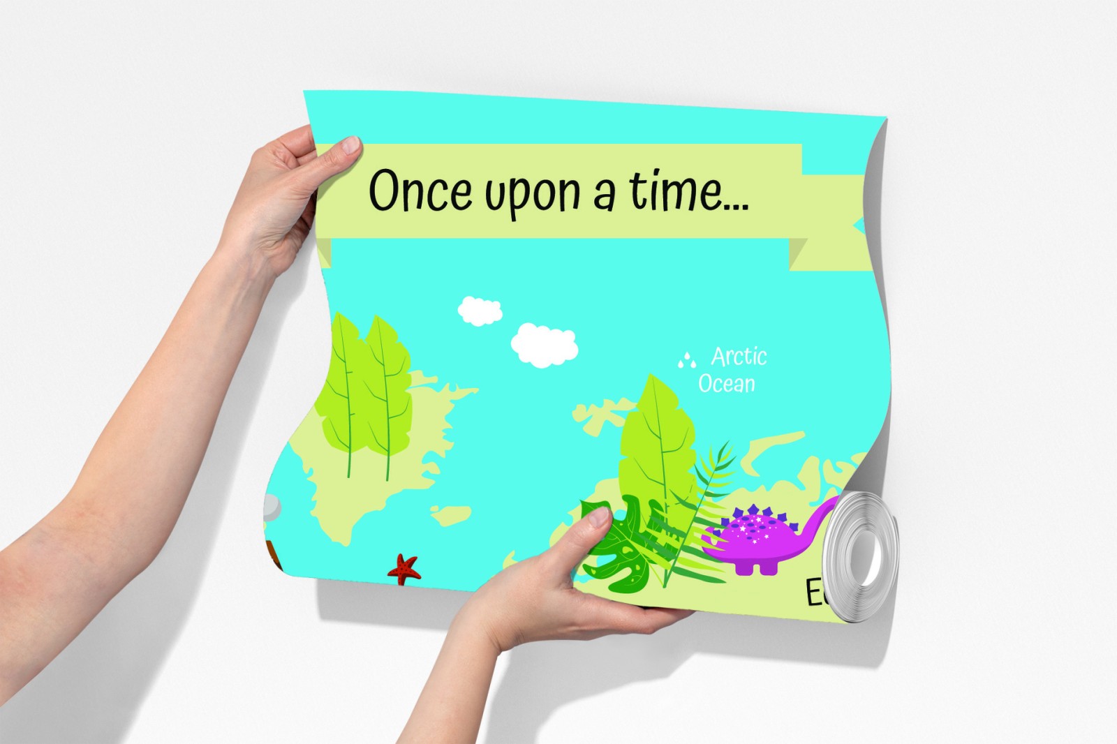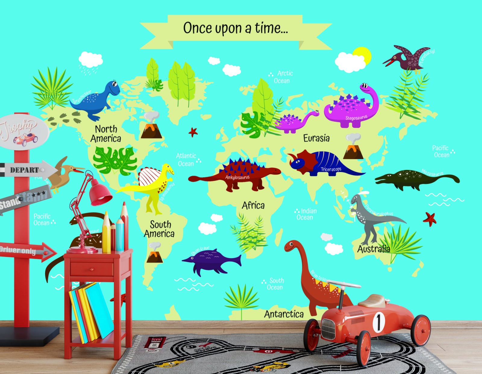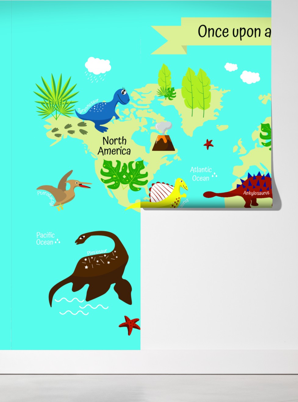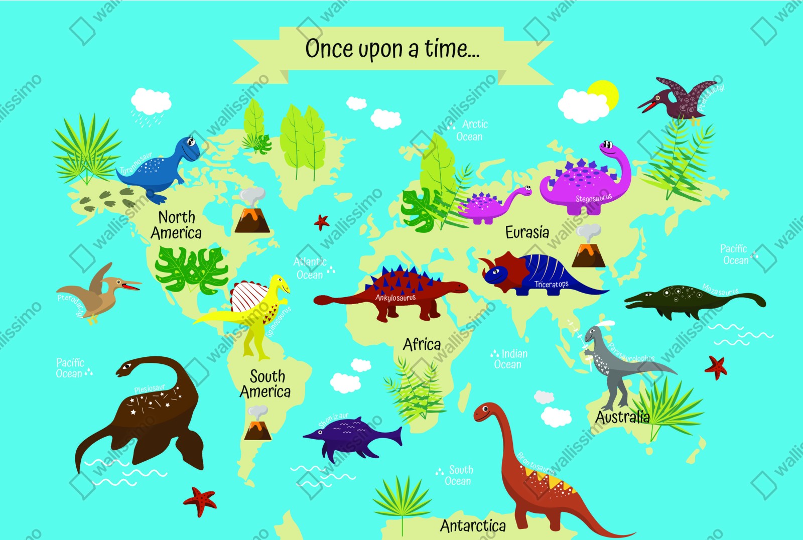 Bunte und verspielte Weltkarte mit Dinosauriern, perfekt zur Dekoration im Kinderzimmer und zur Förderung von Interesse an Geographie und Urzeit.