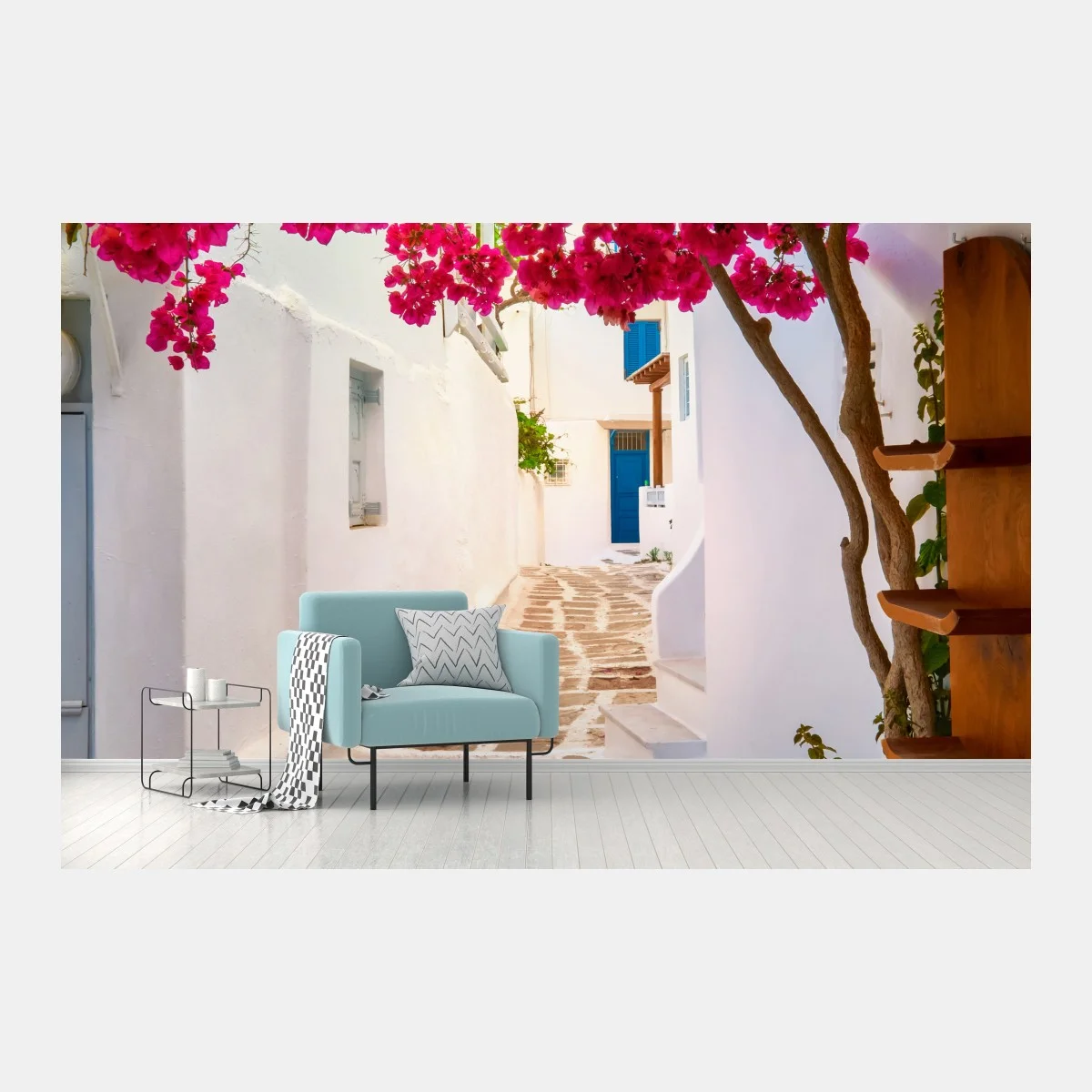 Fototapete Sonnige gasse in Griechenland mit bougainvillea