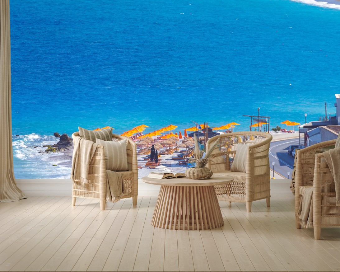 Fototapete Rhodos strand mit bunten sonnenschirmen
